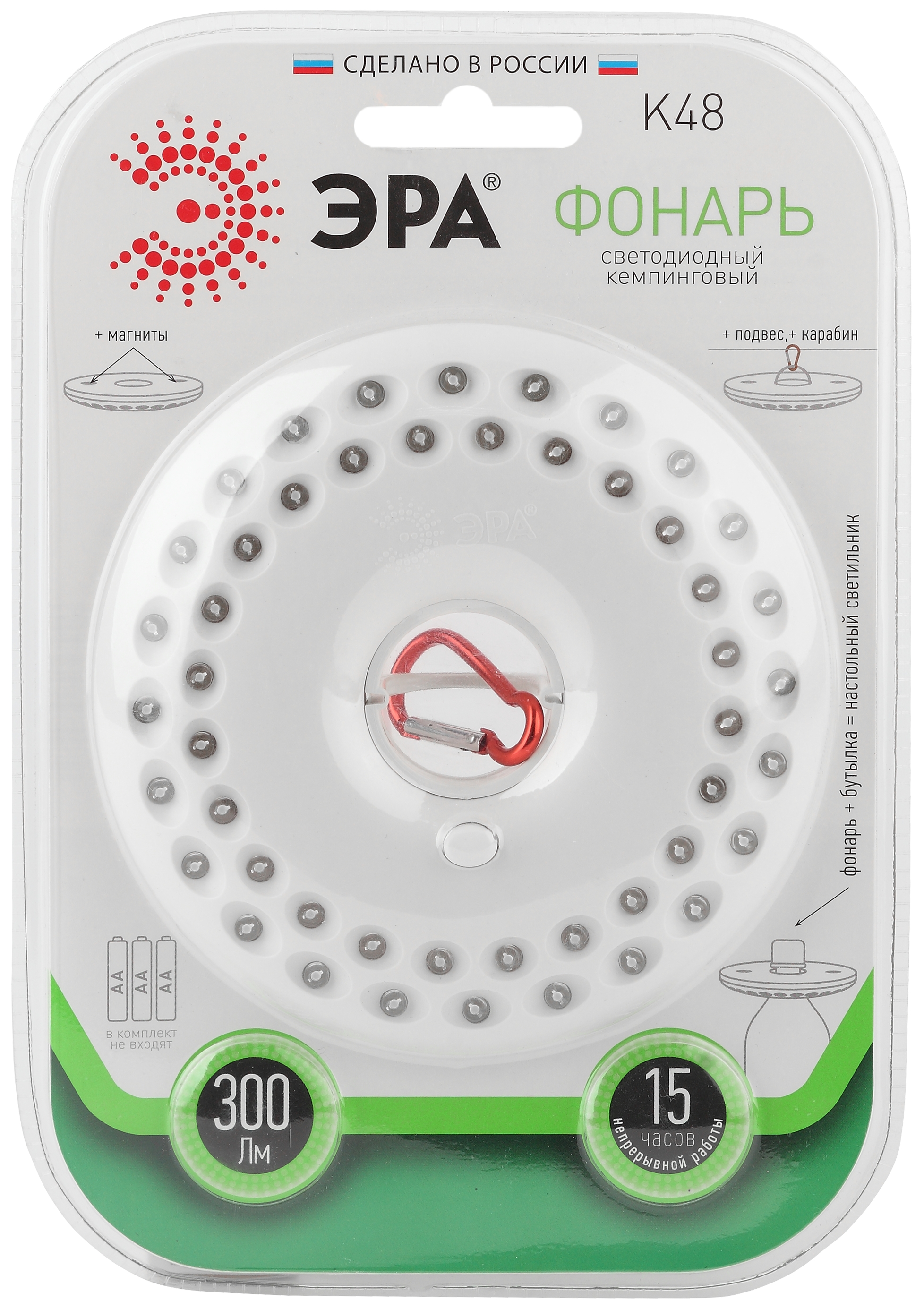 Фонарь собственного дизайна ЭРА, ставший одной из самых популярных туристических моделей. Производится в России. Получил название "НЛО" за круглую форму корпуса и футуристический внешний вид. 48 светодиодов эргономично расположены на корпусе по кругу, они не перегорают, не требуют замены, разумно расходуют заряд и дают яркое освещение. Особое преимущество и настоящая "фишка" ЭРА НЛО-48 - в секретах эксплуатации. Фонарь закрепляется при помощи специального кронштейна (подвес + карабин), превращаясь в яркую походную "люстру". Для металлических поверхностей в тыльную сторону корпуса вмонтированы магниты. Но самый простой способ использования - закрепить на горлышке бутылки. Тогда это уже импровизированный настольный светильник. Надёжный помощник в походе, на охоте, рыбалке, загородном отдыхе. Набирают популярность и нестандартные способы применения ЭРА НЛО-48 - его используют как бюджетный вариант кольцевой подсветки при портретных фотосъёмках. Корпус ЭРА НЛО-48 стал отражением современных bio-тенденций