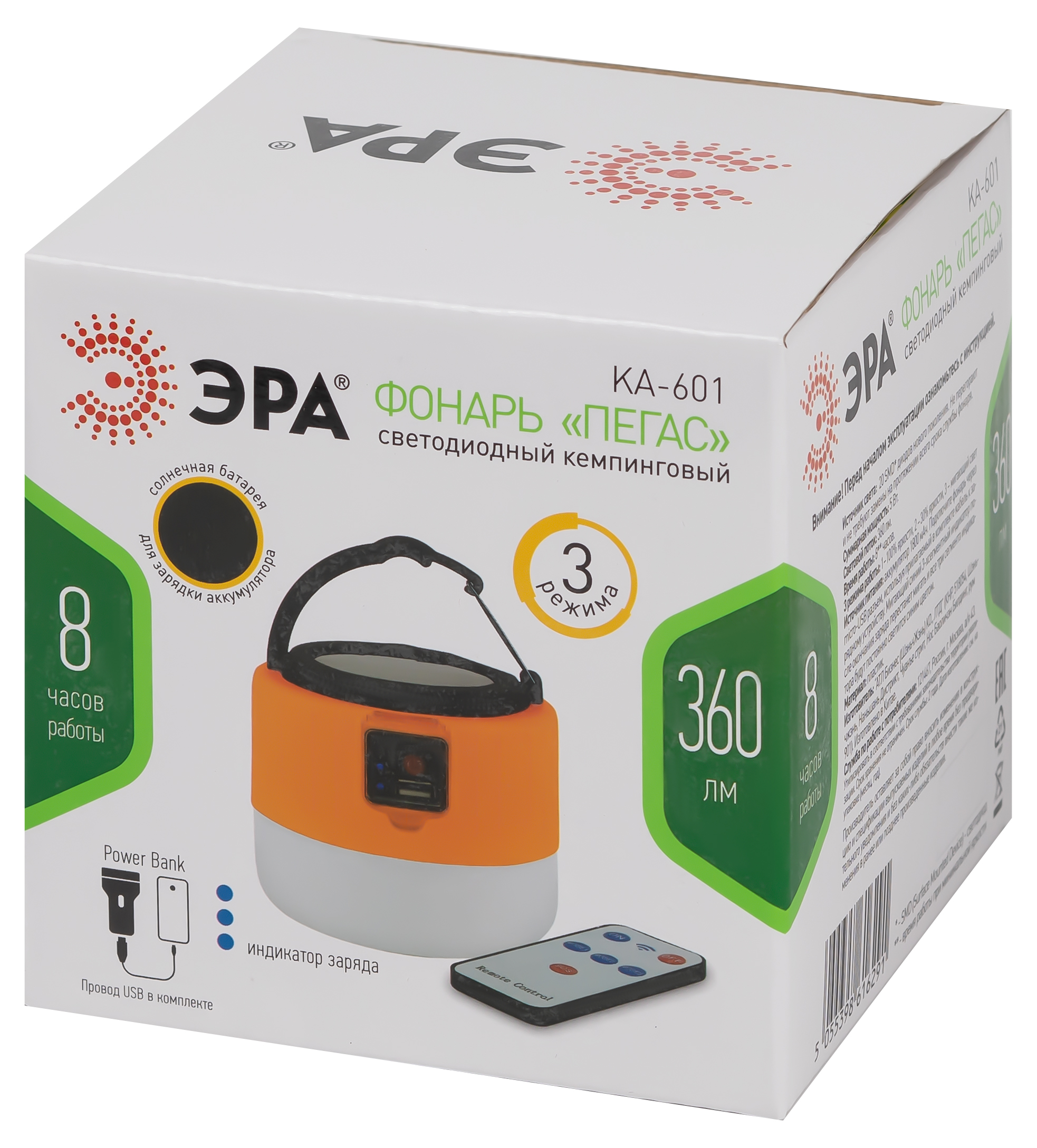 ЭРА КА-601 «Пегас» – инновационный кемпинговый фонарь со встроенной солнечной батареей и пультом дистанционного управления. Аккумуляторный фонарь ЭРА «Пегас» также заряжается от USB (кабель в комплекте). От одной зарядки непрерывно проработает 8 часов. Может использоваться в качестве powerbank – в условиях похода выручит, если нужно подзарядить телефон или другой мобильный гаджет. Мигающий 3-сегментный индикатор покажет уровень заряда аккумулятора. Разъёмы для зарядки фонаря и телефона, а также кнопка включения и управления режимами освещения, спрятаны в специальном отсеке под прозрачной пластиковой крышкой.