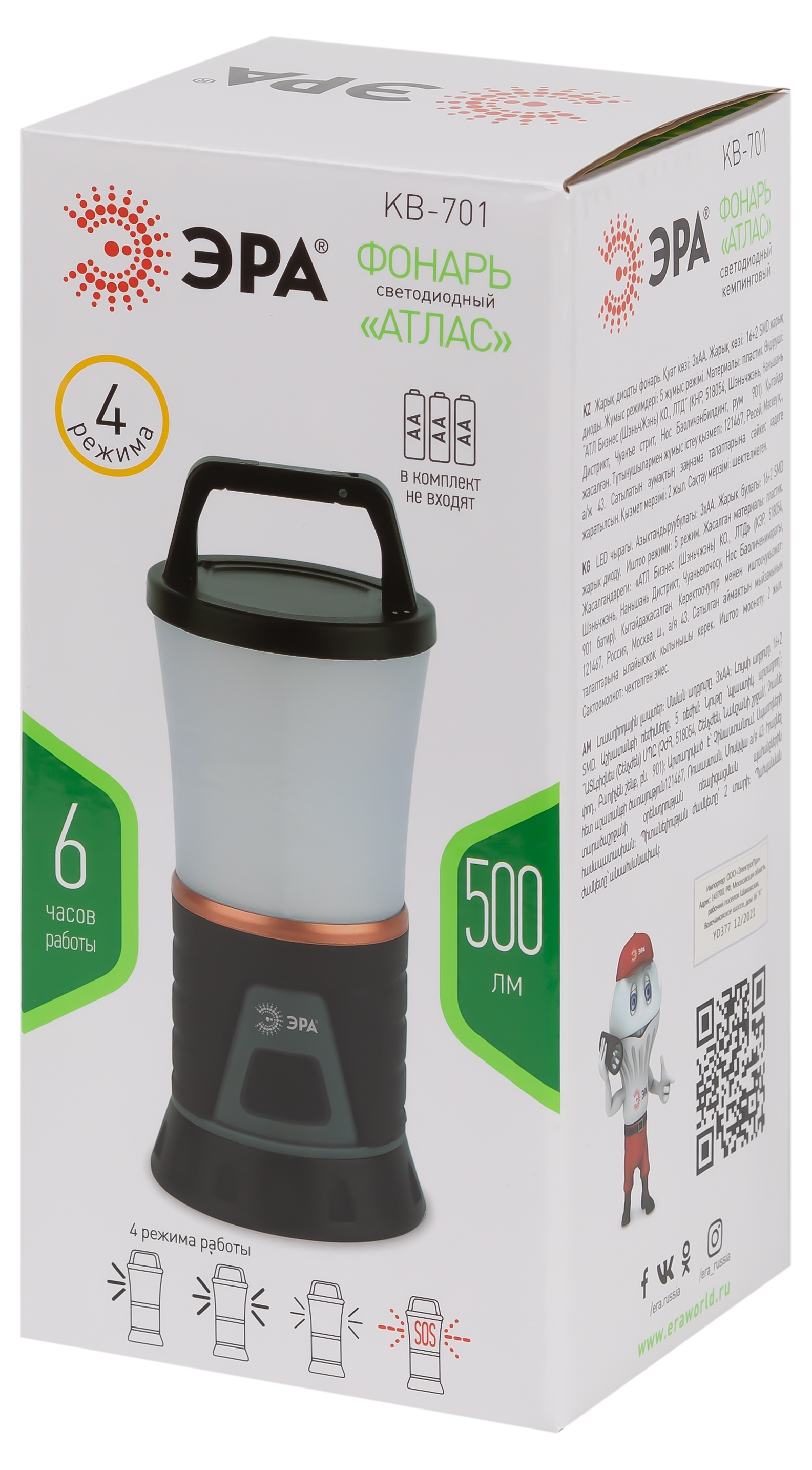 Для комфорта пользователей предусмотрены 4 режима работы фонаря: освещение одной секцией, освещение двумя секциями, режим экономии заряда с 50% яркостью света, аварийное SOS-мигание красным светом. От одного комплекта алкалиновых элементов питания фонарь ЭРА "Атлас" работает непрерывно 6 часов. Световой поток - 500 Лм.