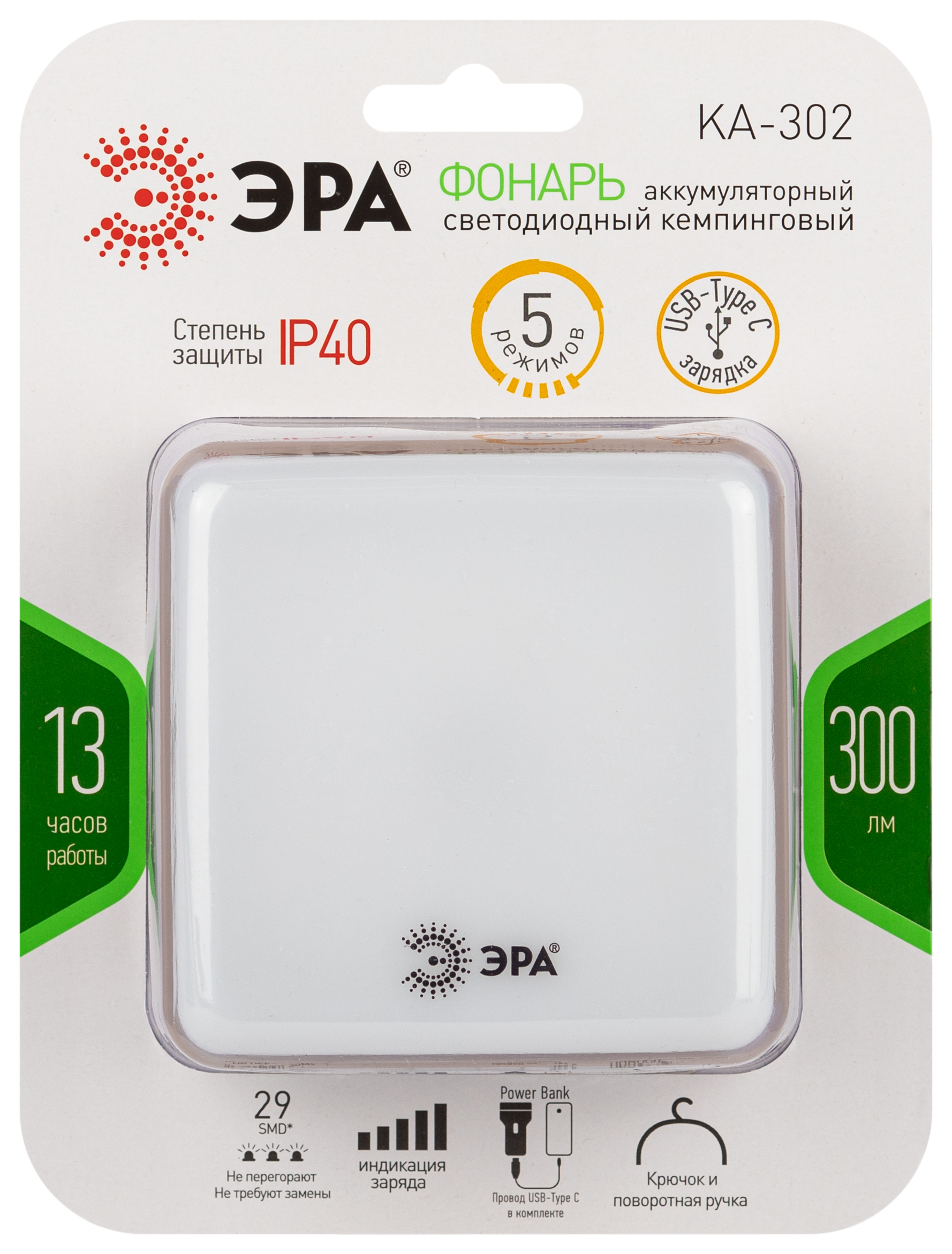 Современный светодиодный фонарь для отдыха на природе, походов, бытовой подсветки — ЭРА KA-302 (артикул Б0061547). Это лёгкий портативный осветительный прибор с автономным питанием от встроенного аккумулятора. Мощность фонаря — 5 Вт. Кабель для подзарядки в комплекте (USB Type-C). Преимуществом данного кемпингового фонаря является не только качественный яркий свет, но и дополнительный функционал — крючок для подвеса, поворотная ручка, функция Power Bank (внешний аккумулятор), индикация заряда / разряда. Для удобства применения в разных ситуациях предусмотрены 5 режимов свечения: 1. основной свет 100% яркости; 2. основной свет 50% яркости; 3. стробоскоп; 4. боковой свет 100% яркости; 5. боковой свет 50% яркости. Максимиальный световой поток — 300 лм. Масимальная дальность светового луча — 150 м. Фонарь изготовлен из прочного пластика, имеет прорезиненные элементы. Заряжается за 2 часа, при минимальной яркости светит до 13 часов от одной пордзарядки.