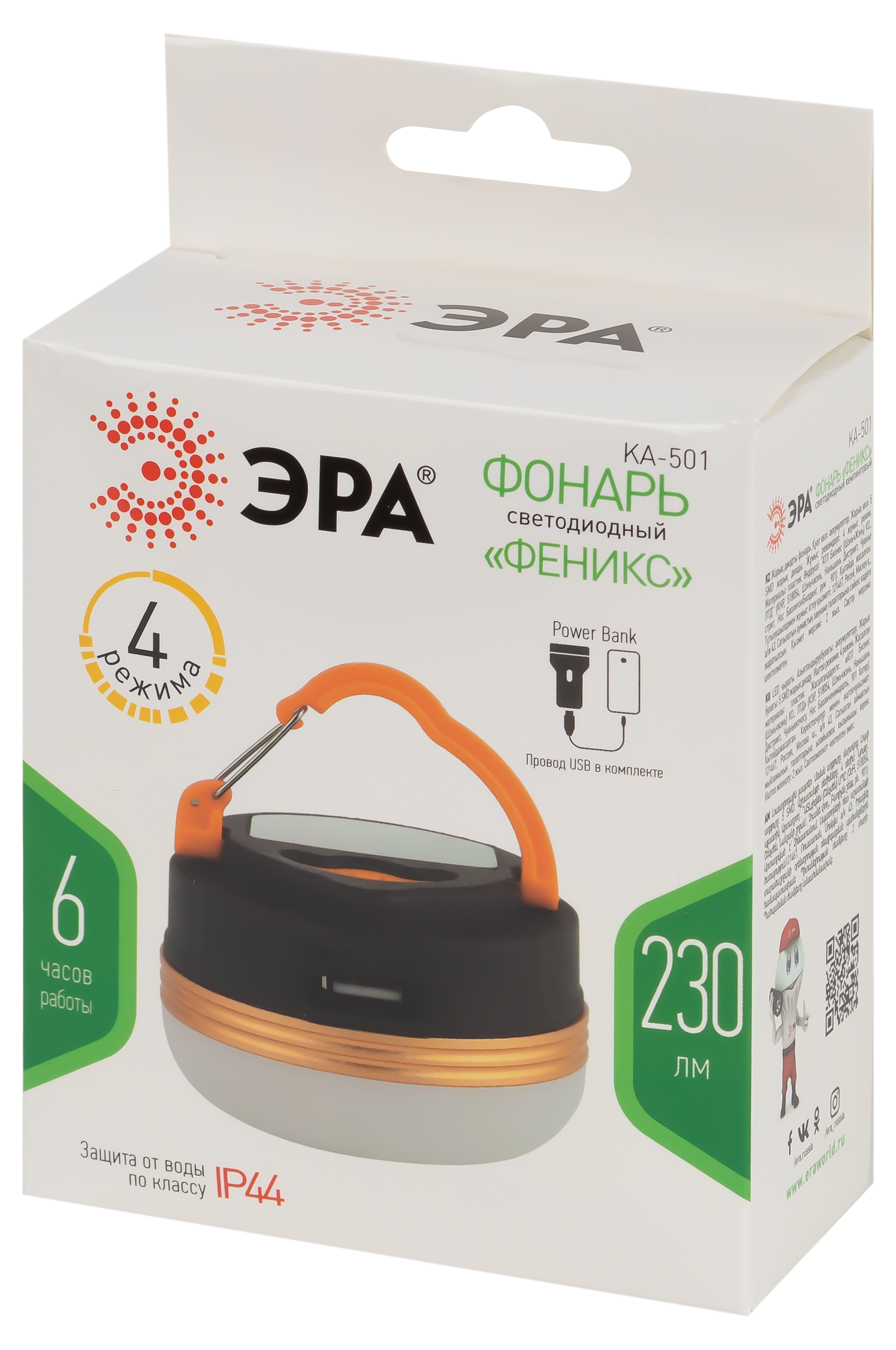 ЭРА KA-501 "Феникс" - компактный кемпинговый фонарь с удобным креплением для подвешивания. Работает от встроенного аккумулятора, USB-кабель для подзарядки в комплекте. Яркий качественный свет создают 5 светодиодов нового поколения. Эргономичный круглый корпус изготовлен из легкого ударопрочного пластика. Одной подзарядки хватает на 6 часов непрерывного свечения. Несмотря на малый размер, отличается хорошим световым потоком - 230 Лм. В зависимости от ситуации выбирайте режимы работы: 1) 100% яркость, 2) 50% яркость; 3) стробирование; 4) SOS. Мощность этого удобного фонарика - 3 Вт. Важное преимущество - фонарь можно использовать как powerbank, подзаряжая от него мобильные устройства. После полной подзарядки непрерывно светит 6 часов. Кемпинговый фонарик ЭРА "Феникс" защищен от влаги и пыли (IP44), он обеспечит вас надежным освещением в любую погоду!