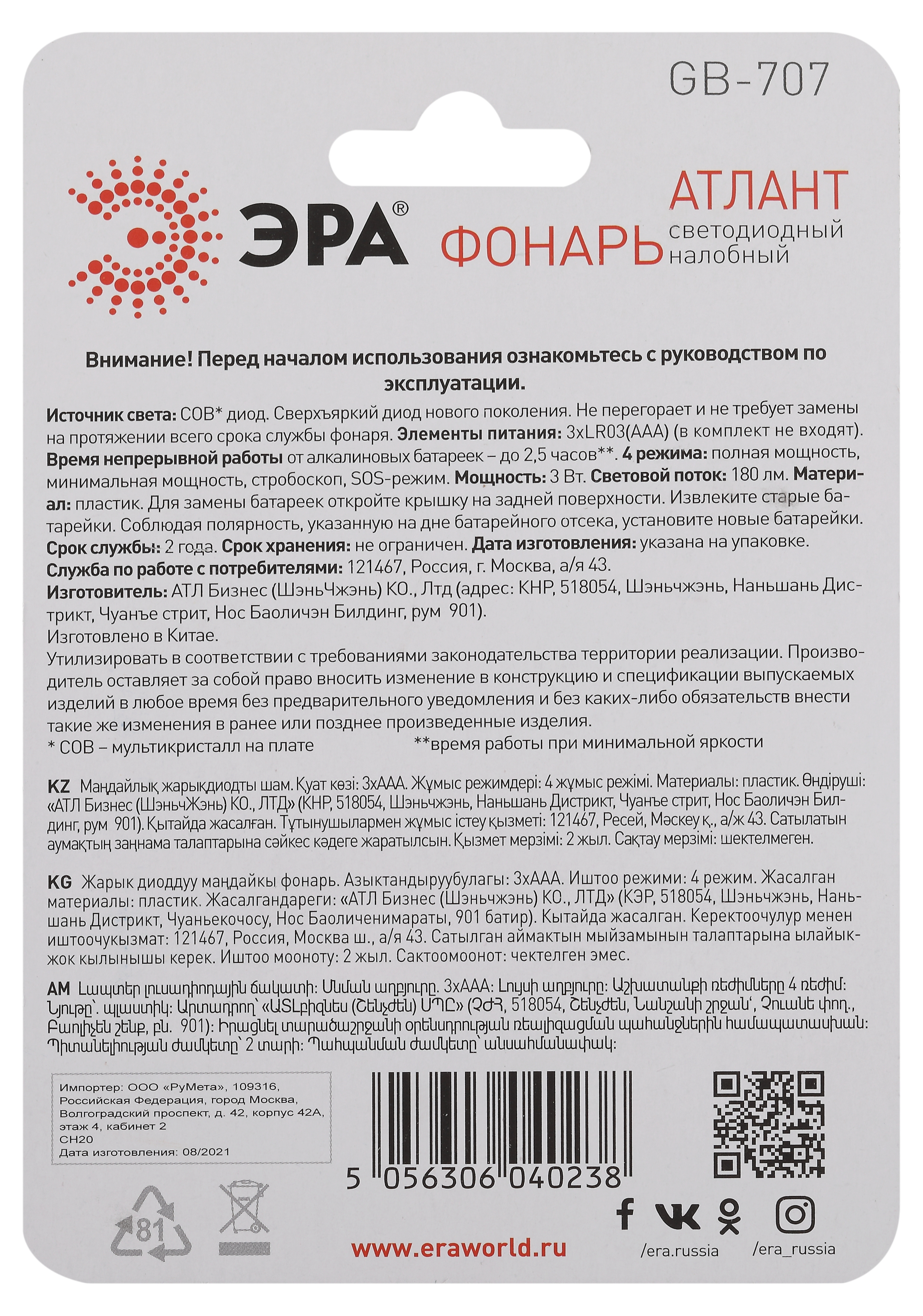ЭРА GB-707 "Атлант" компактный и легкий налобный фонарь с 4 режимами работы. Оснащен COB матрицей, которая создает свет дальностью 13 метров. LED-элемент не перегорает и не требует замены в течение всего срока эксплуатации. Прочный корпус защищен от механических воздействий. Для работы устройства требуются три мизинчиковые батарейки, которых хватает на 2,5 часа свечения при непрерывной работе фонаря. В зависимости от ситуации использования можно выбирать любой из четырех доступных режимов свет повышенной яркости, освещение средней яркости, стробирование, аварийное мигание для нештатных случаев.