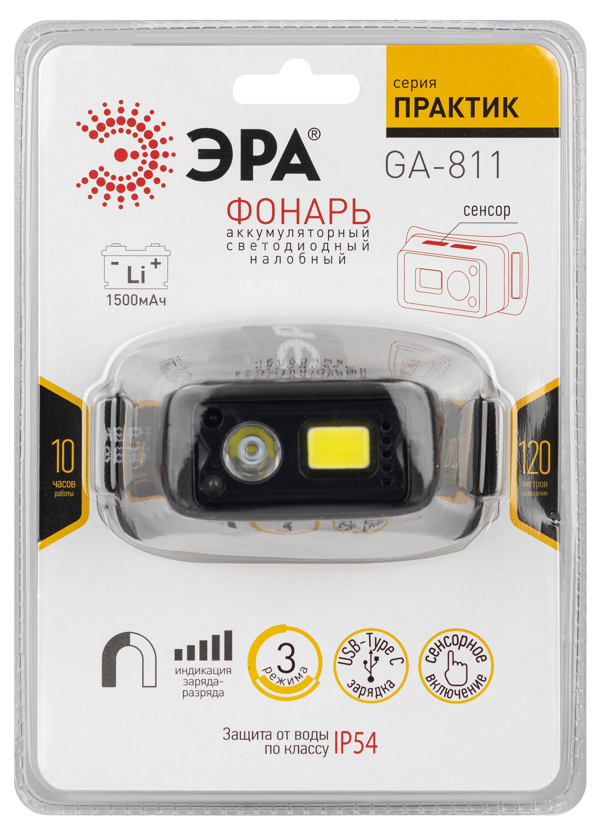 Светодиодный налобный фонарь ЭРА Практик GA-811 (артикул Б0061563) с мягким эластичным ремешком и тремя режимами работы. Можно включать подсветку от встроенного светодиода, от LED-платы СОВ или совмещать оба типа освещения. Максимальная дальность светодиодного луча — 150 метров. Фонарь аккумуляторный — подзаряжается от кабеля USB Type-C (в комплекте), одного заряда хватает на 10 часов непрерывного свечения. Встроен ёмкий литиевый аккумулятор 1500 мАч, есть индикация заряда-разряда. Налобник защищён от воды и имеет прочный корпус. Станет надёжным спутником в путешествии или помощником в работе. Сенсорное включение добавляет комфорта в применении, так как фонарь можно включать лёгким прикосновением к корпусу.