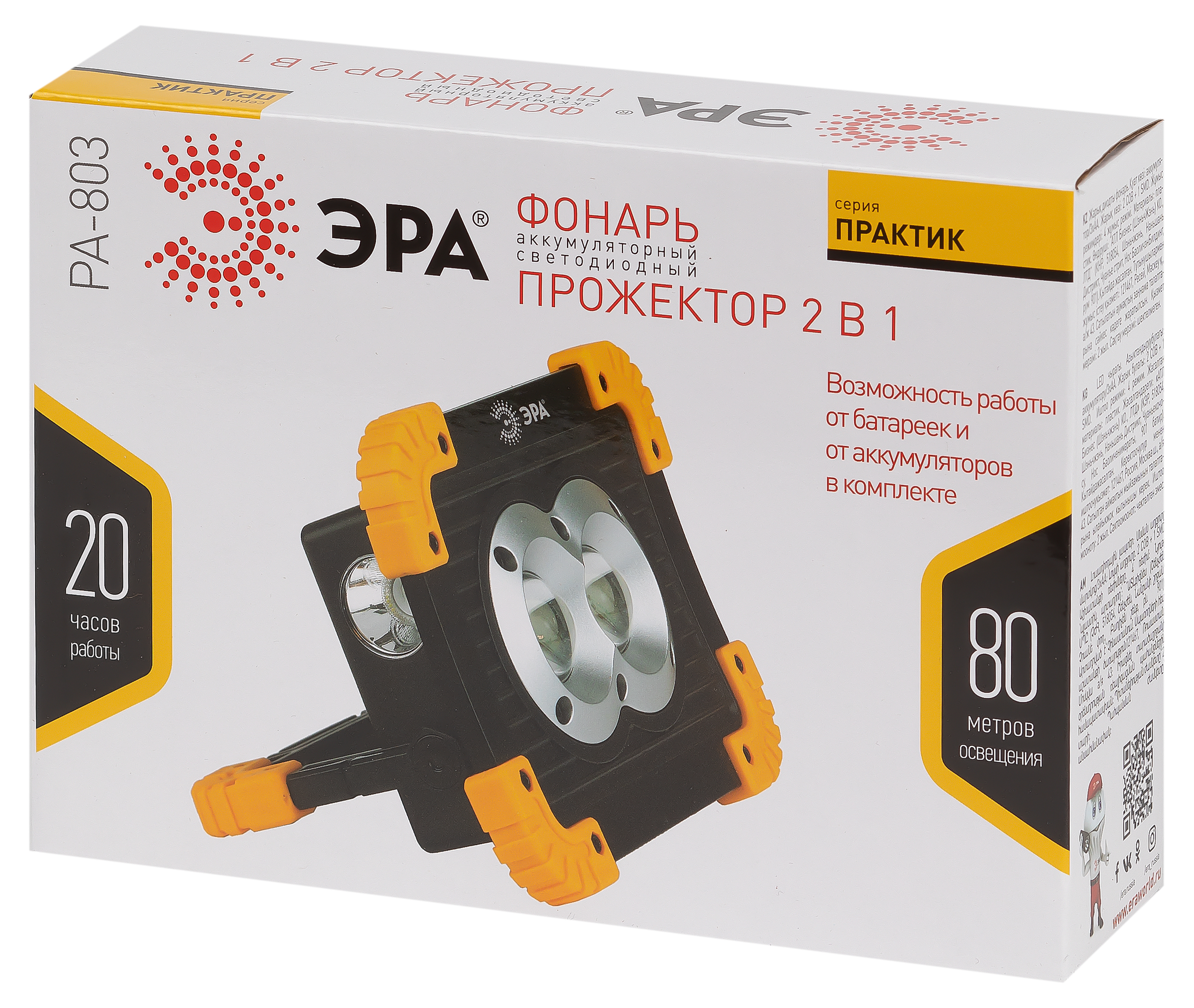 ЭРА PA-803 - стильный компактный фонарь-прожектор с двумя типами питания: от встроенного аккумулятора либо от двух пальчиковых батареек (2 х АА). Входит в специальную серию "Практик", созданную специально для рабочих профессий. Успешно применяется на стройках, при ремонте и монтаже. Станет вашим надежным помощником в быту, в поездках. Удобная поворотная ручка-подставка дает возможность регулировать направление света, фиксировать фонарь в различных положениях, подвешивать. Фонарь имеет двойной светильник из сверхъярких COB-светодиодов, а также боковой свет с направленным лучом (1 LED). Высокий световой поток - 860 Лм. 4 режима работы для разных задач: 1) боковой свет; 2) головной свет 100% яркости; 3) головной свет 50% яркости; 4) головной мигающий свет. Яркий необычный фонарь запоминающегося дизайна! Эргономичная прямоугольная форма, защитные вставки по углам, эффектная черно-желтая цветовая гамма.