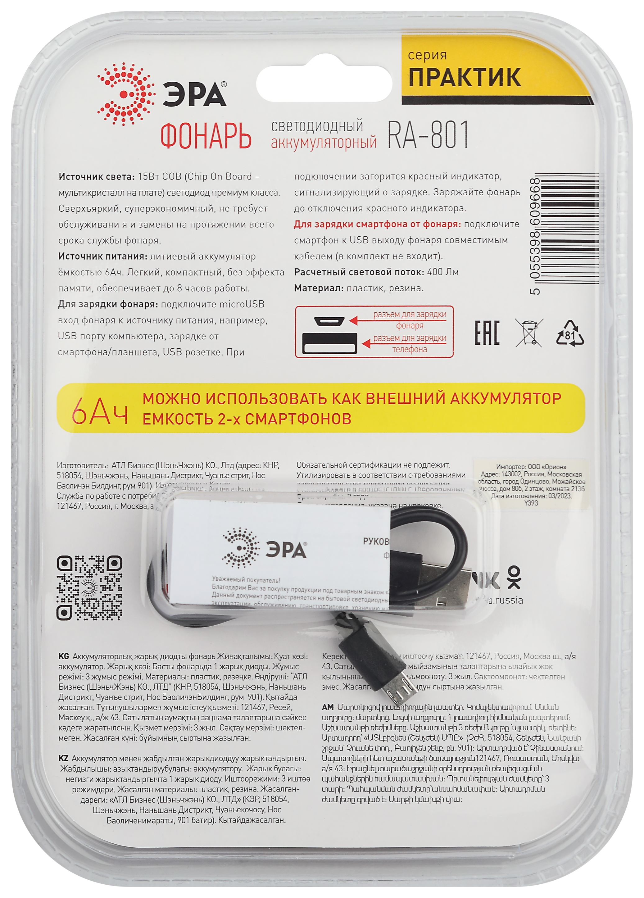 ЭРА RA-801 мощный фонарь-powerbank с литиевым аккумулятором. Яркий свет + возможность оперативно подзарядить любое мобильное устройство. Два функциональных гаджета в одном! Незаменимая вещь в путешествии, за городом, на строительных и ремонтных работах. Мощный литиевый аккумулятор 6 000 мАч - гарантия бесперебойной работы устройства в течение 8 полных часов. USB-шнур в комплекте.