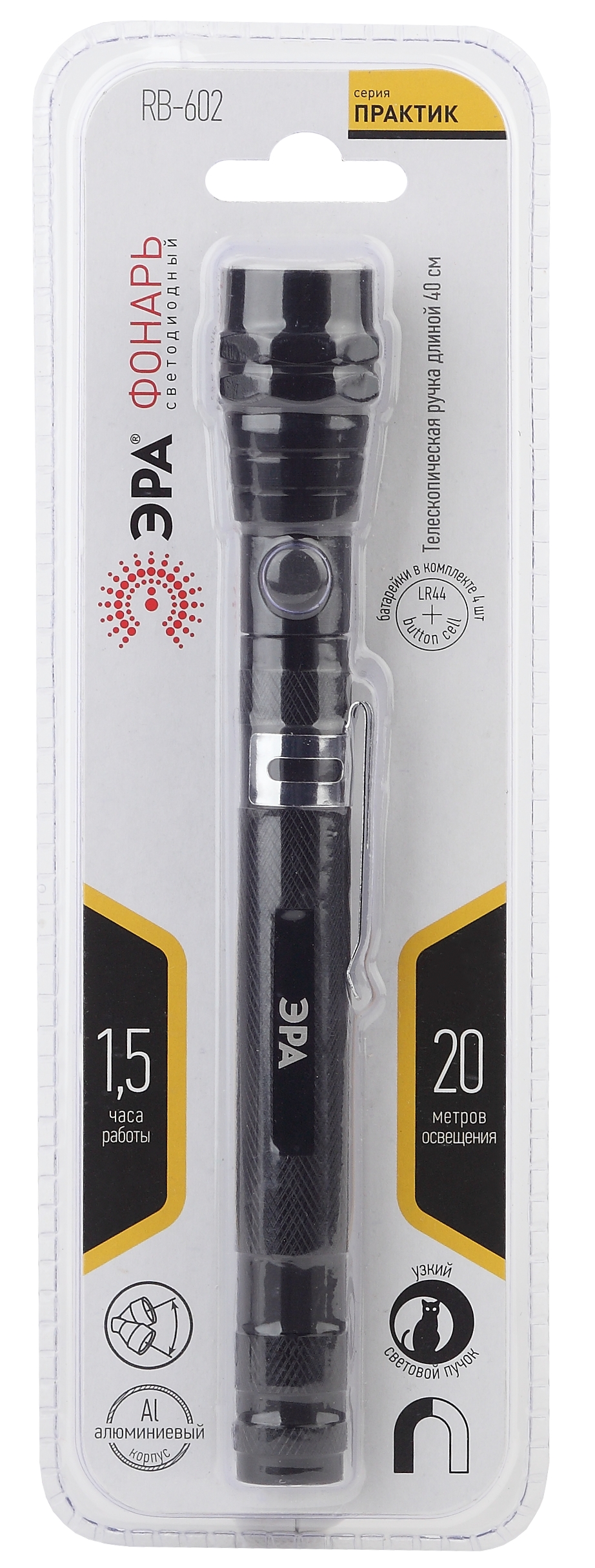 ЭРА RB-602 - металлический LED-фонарь с удлиняющейся телескопической ручкой и гибким магнитным наконечником. Три ярких светодиода последнего поколения - не тускнеют со временем и не нуждаются в замене. Направленный световой луч оптимальной дальности. Фонарь с телескопической ручкой - большая редкость на рынке. Он не только способен удивить своим функционалом, но и становится отличным помощником в нештатных ситуациях. С помощью ЭРА RB-602 можно отлично подсветить даже самые отдалённые и недоступные уголки помещения - ручка удлиняется почти в 4 раза и достигает практически полуметра длины. При этом она очень тонкая и проникает даже в узкие пространственные промежутки. Три ярких светодиода находятся в верхней гибкой части ручки - бонус для освещения труднодоступных мест. Ещё одно преимущество - светодиодная часть имеет магнитную подложку, таким образом фонарь помогает достать закатившиеся под мебель мелкие металлические предметы. В собранном виде ЭРА RB-602 очень компактен - 18 см в длину и всего сантиметр в ширину.