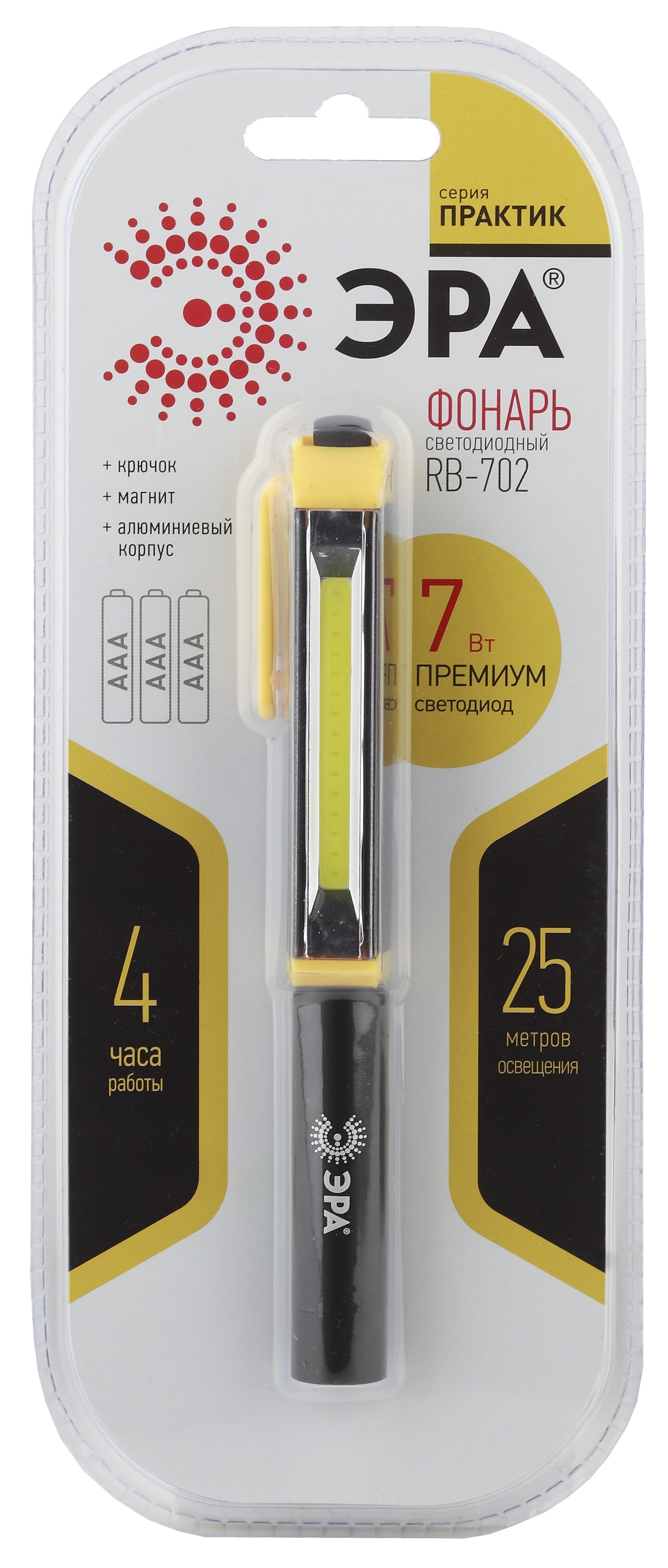 Еще один способ использовать ЭРА RB-702 "без рук" - закрепить его на любой металлической поверхности при помощи встроенного магнита. Установив 3 батарейки ААА, вы получите полные 4 часа непрерывной работы фонаря и 25 метров освещения.