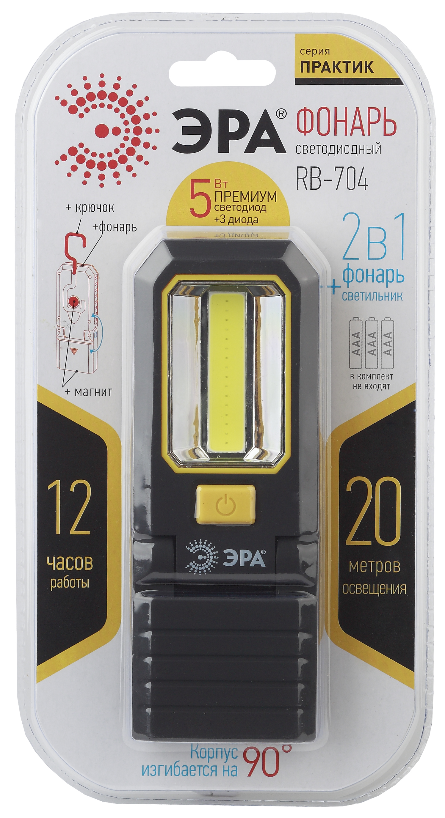 ЭРА Практик RB-704 - многофункциональный светодиодный фонарь с режимом светильника и двумя типами крепления. Корпус сгибается в двух направлениях (по 90 градусов каждое). На торце - мощный магнит. Дополнительный магнит расположен на задней стороне фонаря. Имеется удобный прочный крючок. Закрепив ЭРА RB-704 на нужной поверхности, можно быстро настроить необходимый для работы угол освещения. Переключение режима превращает фонарь в светильник c ближним заливающим светом. Фонарь ЭРА Практик RB-704 незаменим как при профессиональных работах (строительство, ремонт, монтаж, обслуживание), так и в частном использовании (работы в доме, на приусадебном участке, путешествия). Покрытие корпуса - софт-тач (мягкое, приятное на ощупь, без скольжения). Основной режим освещения - яркая LED-плата СОВ (5 Вт). Сопутствующий - 3 диода на торце с направленным лучом длиной до 20 метров. Сверхмощные светодиоды COB ("chip on board" - "кристалл на плате") ранее применяли исключительно в промышленном освещении, сейчас технологию удалось адаптировать под универсальные цели. Получился яркий и при этом мягкий ровный свет. Одного комплекта батареек (3 мизинчиковые) хватит на 12 часов непрерывной работы.