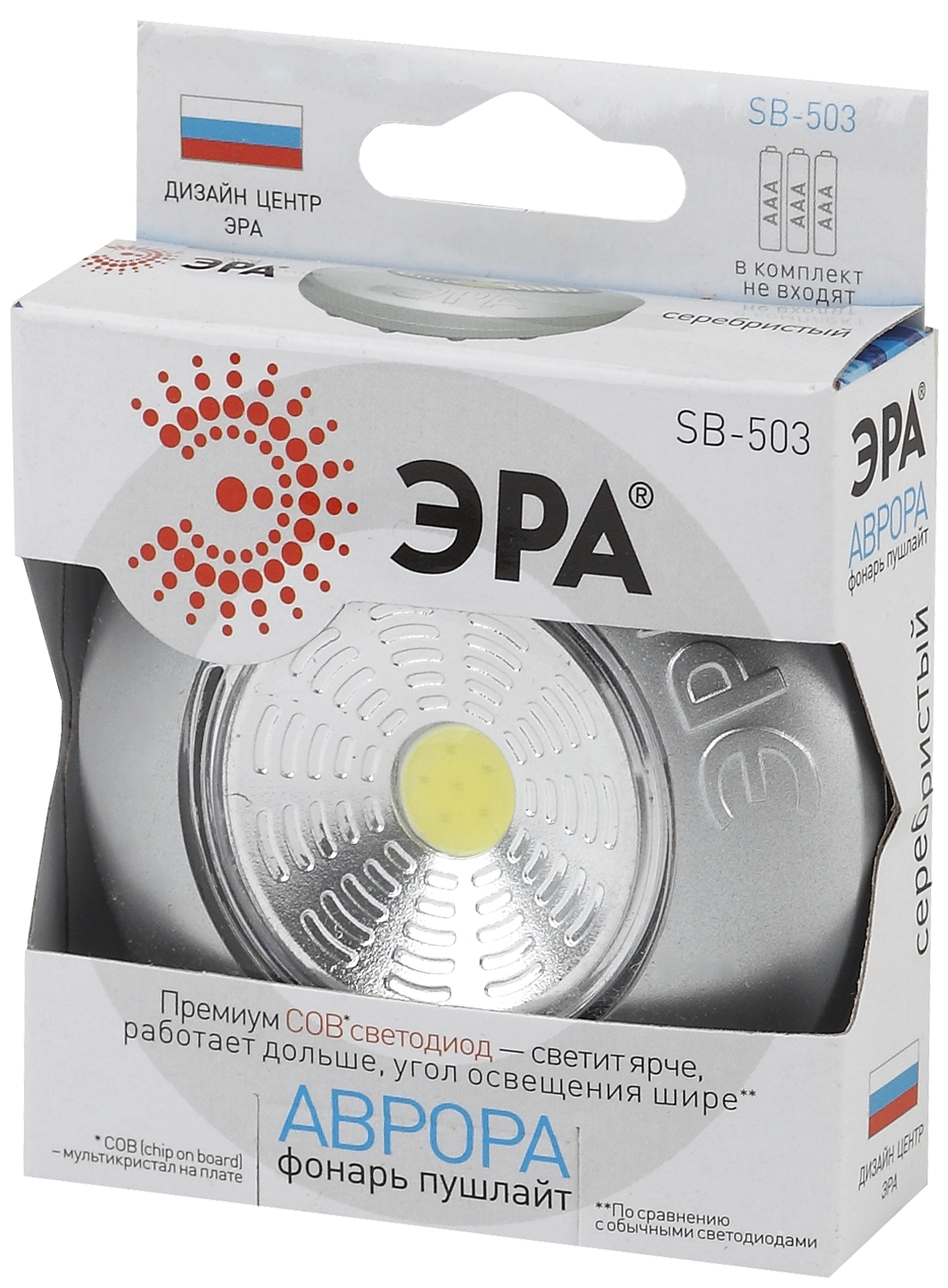 Светодиодный фонарь SB-503 "Аврора" - простой, компактный и очень удобный вариант освещения небольшого пространства. Фонарь снабжен самоклеящимся элементом. Достаточно снять защитную пленку и прикрепить фонарь на ровную и чистую поверхность. Пушлайт легко включается легким нажатием ладони на поверхность фонаря, выключается таким же способом. Фонарь излучает мягкий световой луч на расстояние до 5 метров. Равномерный свет, без мигания обеспечивают светодиоды современного поколения. Работает от трех батареек ААА (в комплект не входят). Менять батарейки можно, не отклеивая фонарь. Пушлайт SB-503 от компании Эра удобно применять в комнате, шкафу, гараже, во время туристических походов (в палатке, шатре). Светодиодный фонарь "Аврора" - отличный вариант беспроводного источника света в любой ситуации.