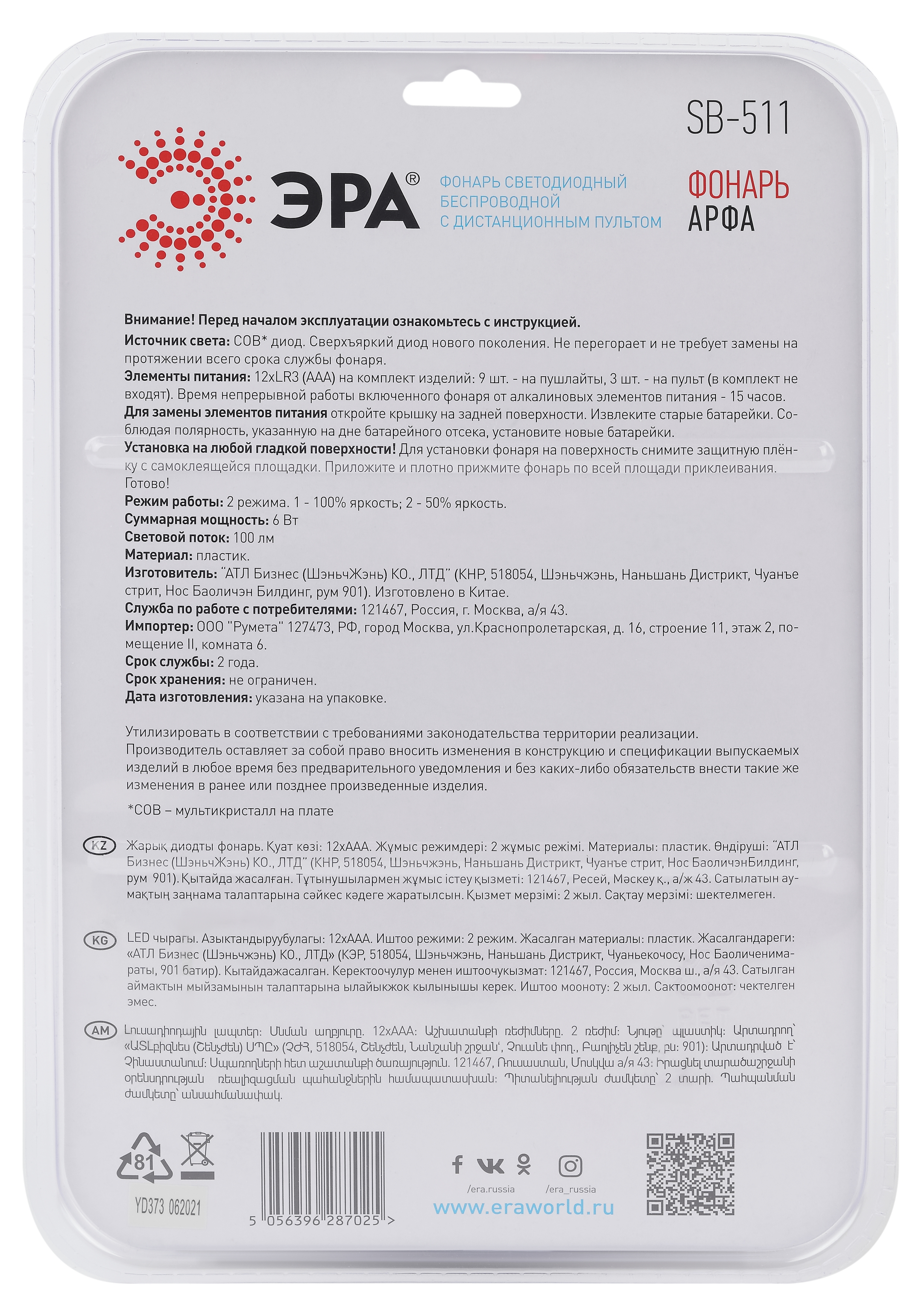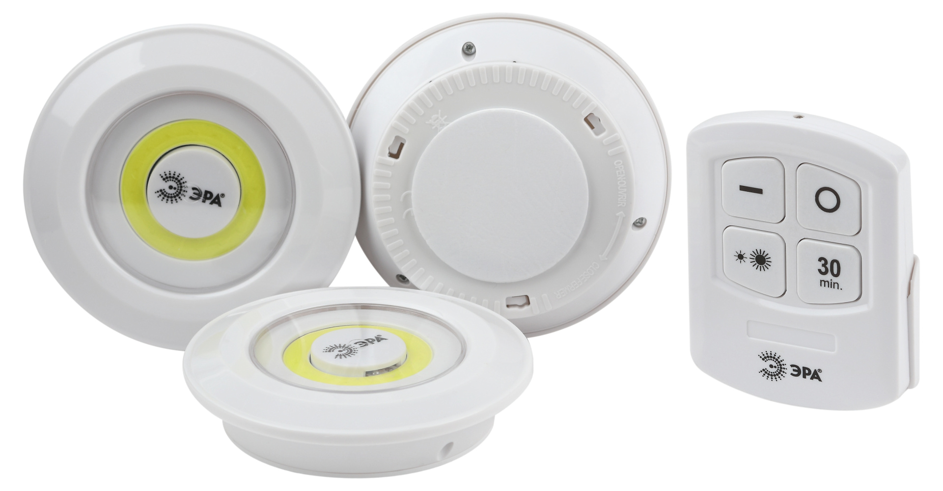 ЭРА Арфа SB-511 "АРФА" - светодиодный беспроводной фонарь с пультом дистанционного управления, он позволяет включать подсветку и изменять яркость на расстоянии, а также устанавливать таймер работы освещения 30 минут. Состоит из 3 компактных самоклеящихся пушлайтов, которые можно включать и пультом, и нажатием на кнопку в центре корпуса. Монтируются на поверхность без сверления - просто отклейте защитный слой и приклейте фонари. В комплекте настенный держатель для пульта на липучке. Круглая форма, небольшие размеры, малый вес и базовый белый цвет делают ЭРА SB-511 универсальной бытовой подсветкой, которую стоит купить в квартиру, загородный дом, на дачу. Удобно подсвечивать затемненные части комнат, кладовки, шкафы, полки, столешницы под кухонными шкафами. Для работы нужны 12 мизинчиковых батареек: 9 для пушлайтов и 3 для пульта (в комплект не входят). Комплекта алкалиновых батареек хватит на 15 часов непрерывного свечения. В пушлайтах установлены сверхъяркие светодиоды последнего поколения.
