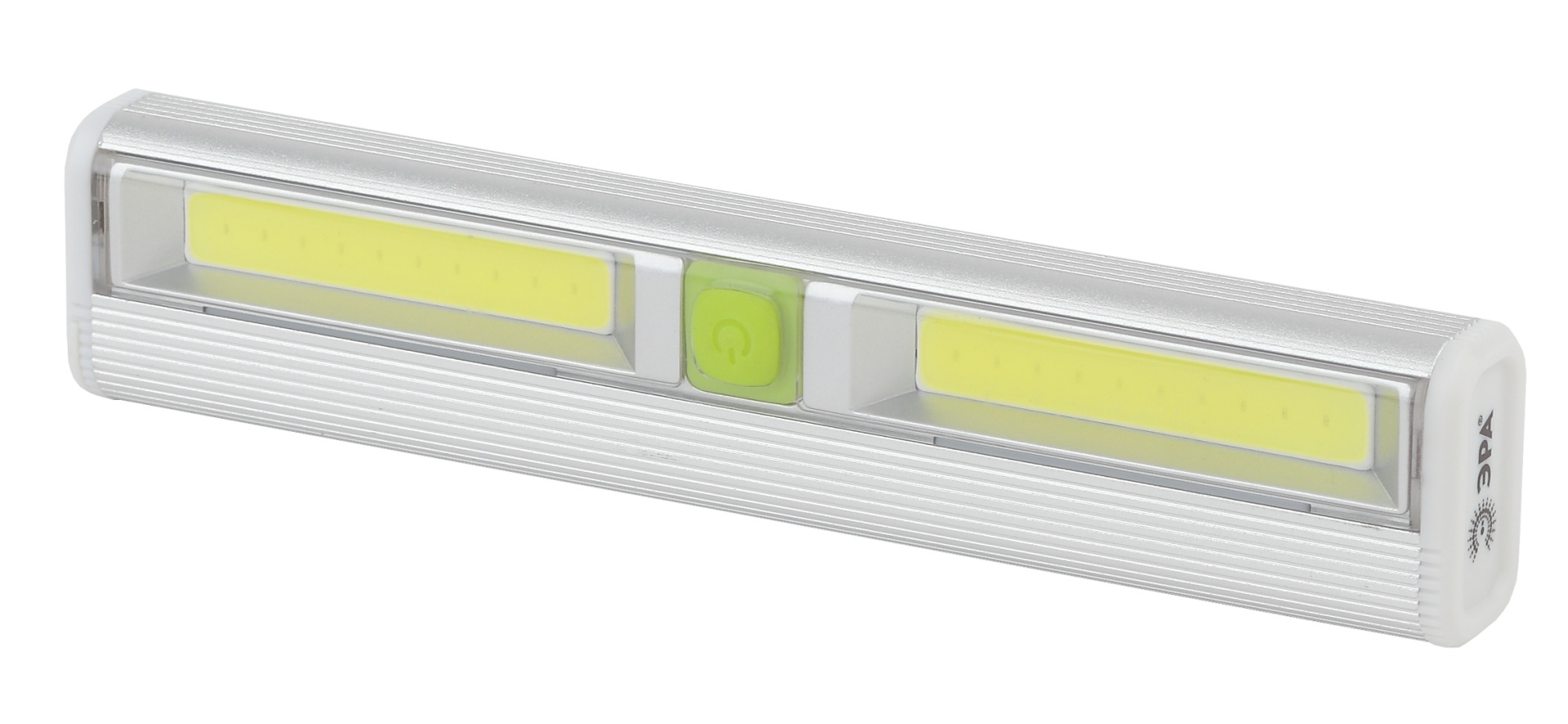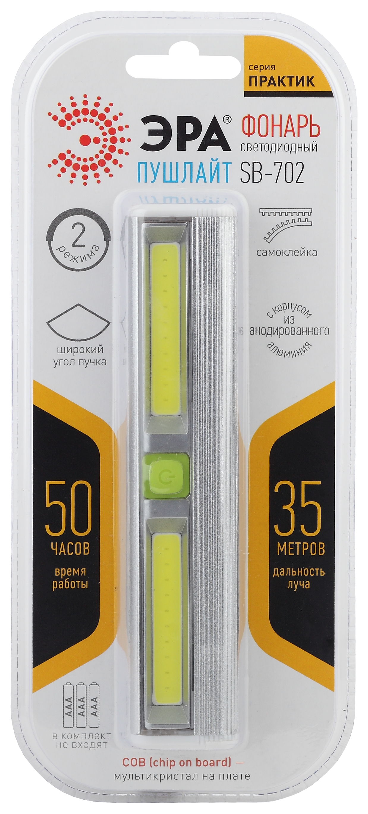 SB-702 - светодиодный фонарь-пушлайт с двумя режимами работы и несколькими типами креплений - самоклеющаяся основа, магнит, два отверстия для подвешивания на болты/гвозди. Прочный корпус из анодированного алюминия. Широкий угол светового пучка. Яркий заливающий свет, который не слепит глаза и не мерцает. Компактный фонарь-пушлайт легко крепится к любой гладкой поверхности и становится отличным решением для освещения пространств, где нет стационарного света, или для дополнительной подсветки затемнённых мест. ЭРА SB-702 размещают в подсобных помещениях, на отдалённых полках гардеробных, под кухонными шкафами. Он включается и отключается быстрым нажатием на кнопку, расположенную в центре корпуса. Повторное нажатие кнопки активирует эконом-режим с 30% яркости. Кнопка включения покрыта мягким прорезиненным материалом, препятствующим скольжению. Даёт широкое заливающее освещение при помощи двух светодиодных пластин СОВ (chip on board - мультикристал на плате), это промышленная технология, адаптированная для универсальных целей. Получился яркий, но при этом ровный мягкий свет, идеальный для бытовой подсветки. LED-платы не тускнеют со временем и не нуждаются в замене. Для того, чтобы закрепить фонарь в любом удобном месте, нужно просто отсоединить защитную плёнку и приклеить устройство с помощью прочной самоклеющейся основы. Одна минута - и вы обеспечены качественной подсветкой! На металлические поверхности ЭРА SB-702 крепится и вовсе за считанные секунды - в корпус встроен магнит. Устройство экономично - от одного комплекта батареек (3хААА) работает 50 активных часов.