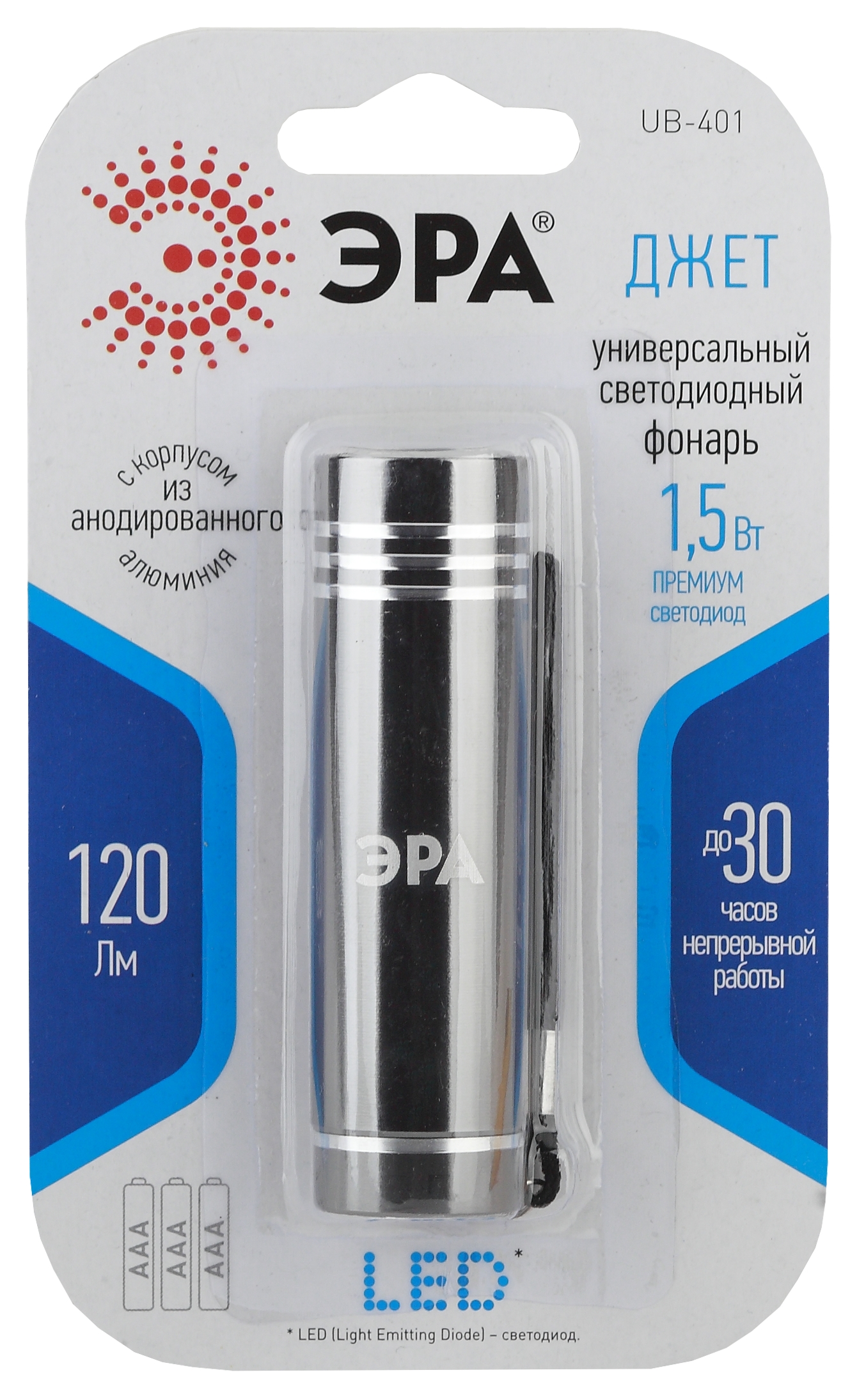 Универсальный светодиодный фонарь "Джет" с корпусом из анодированного алюминия. Такой корпус очень надёжный, не подвергается коррозии, очень прочный и долговечный. Этот фонарь компактный и очень простой, он создан для повседневного использования в быту. Именно поэтому он сделан из качественного материала.Особенность светодиодных фонарей ЭРА - светодиоды нового поколения. В фонаре "Джет" использованы светодиоды премиум класса, они на 50% ярче стандартных и имеют цветовую температуру 6000К. Это значит, фонарь светит ярким белым светом, приближенным к естественному, и не отдаёт в синеву. Фонарь обеспечивает до 30 часов непрерывной работы с мощностью в 1,5 Вт. Этого более чем достаточно для использования в городских условиях. Дальность луча "Джет" - 120 метров. Фонарик легко носить и хранить, с ремешком, который позволит прицепить фонарик к карману или повесить на сумку. "Джет" - маленький, качественный фонарик для самых разных бытовых нужд.
