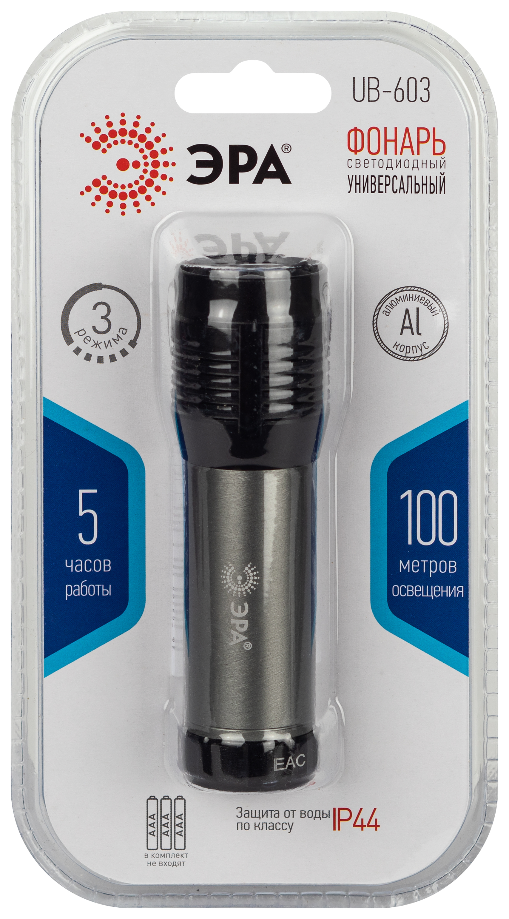ЭРА UB-603 – светодиодный ручной фонарь на батарейках. Работает в 3 режимах: максимальная яркость, 50% яркости, стробирование. Защищён от влаги и пыли – IP44. В фонаре установлен яркий светодиод последнего поколения. Мощность данного LED-фонаря – 3 Вт. Удобный ручной фонарик от торговой марки ЭРА создаёт луч дальностью до 100 метров. Регулировка светового луча позволяет использовать фонарь максимально удобно – создавать широкий заливающий свет или ярко подсвечивать конкретную область. Фонарь светодиодный ЭРА UB-603 отличается высоким для портативного фонаря световым потоком – 275 Лм. Источники питания – мизинчиковые батарейки (ААА), 3 шт.