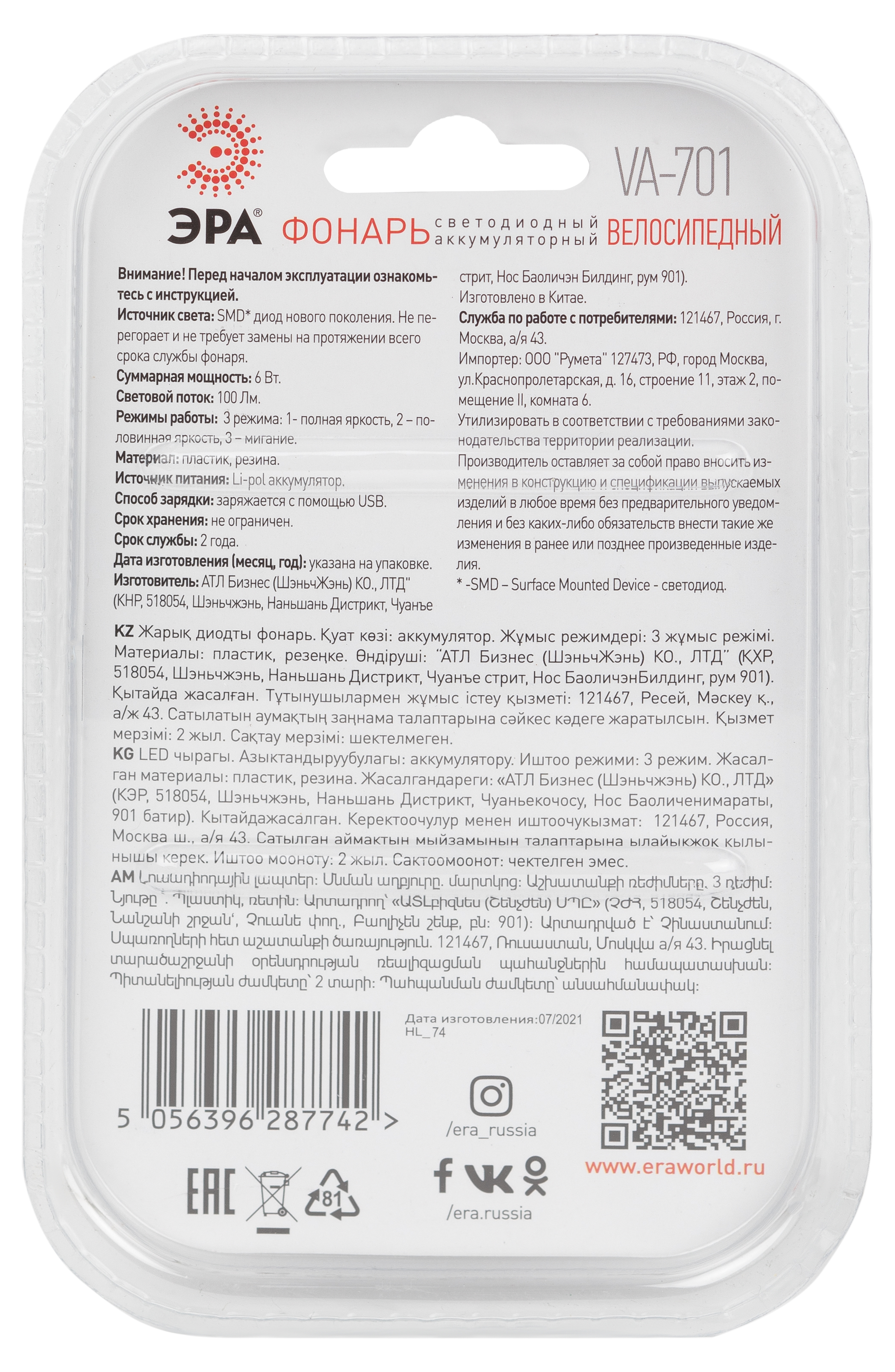 ЭРА VA-701 - эргономичный велосипедный LED-фонарь в силиконовом чехле. Удобно крепится на руль или раму без дополнительных аксессуаров. Работает от встроенного литиевого аккумулятора, подзаряжается от USB (microUSB-кабель в комплекте!). Обеспечит ваши велопоездки качественным ярким светом в трех режимах - 100% яркости, 50% яркости, мигание. Световой поток - 100 Лм. В этом современном велофонаре от торговой марки ЭРА установлены светодиоды нового поколения - не тускнеют и не перегорают в течение всего срока службы. Мощность велофонарика - 6 Вт. От одной полной подзарядки без перерывов светит 4 часа.
