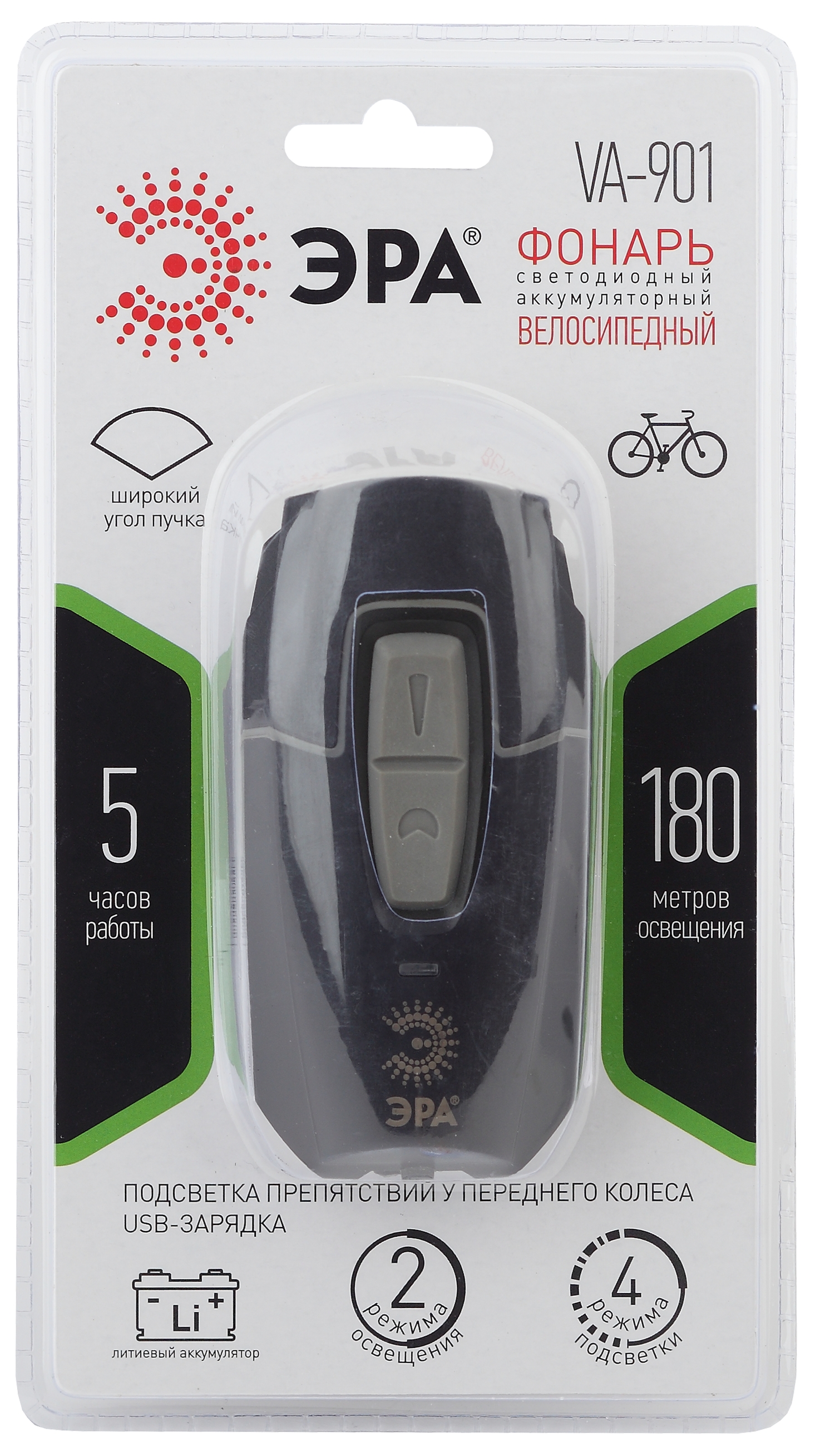 ЭРА VA-901 (арт. Б0033767) — аккумуляторный велосипедный LED-фонарь с подзарядкой через USB-порт (кабель в комплекте). Одного полного заряда хватает на 5 часов свечения благодаря ёмкому литиевому аккумулятору. Велофонарь отличает высокая дальность освещения и широкий угол светового пучка. Фонарь можно использовать в дождь (влагозащита — IP42). Светодиодный фонарь изготовлен из ударопрочного пластика, имеет надёжное крепление к велосипеду. Резиновые вкладки делают крепление универсальным для любого диаметра.