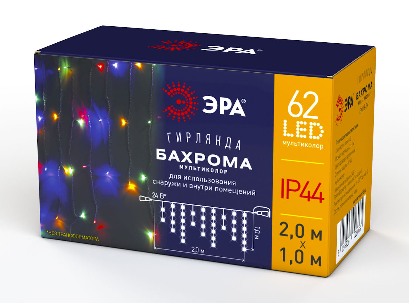 Разноцветная праздничная гирлянда ЭРА "Бахрома" (арт. Б0041906) со светодиодными лампочками на проводах разной длины. Создаёт многоуровневую нарядную подсветку, является идеальным решением для украшения окон, новогоднего оформления помещений. Защищена от влаги и пыли, морозостойка, поэтому с успехом может применяться на улице. Полупрозрачный повод практически не заметен - гирлянда будет хорошо смотреться в интерьере любого стиля. Длина гирлянды - 2 метра, максимальная длина отдельной нити - 1 метр. Каждая нить светится своим цветом - красный, зелёный, жёлтый или синий. LED-элементы формируют насыщенные яркие оттенки. Ровное приятное для глаз свечение создают 62 светодиода последнего поколения. Они не перегреваются даже при непрерывной многочасовой работе гирлянды и не тускнеют со временем. ЭРА "Бахрома" прослужит много лет, будет радовать в любой праздник. Современная светодиодная технология экономит до 90% электроэнергии. Гирлянда отвечает требованиям пожарной безопасности, работает от трансформатора. Трансформатор ЭРА, преобразующий входное напряжение 210-240 В в выходное 24 В: http://www.eraworld.ru/catalog/2647679 (Б0041911).