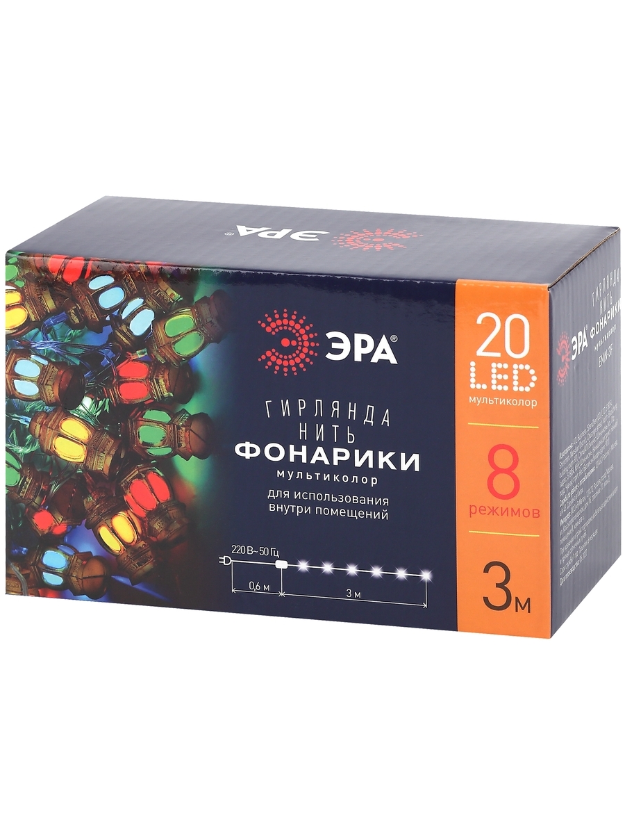 Новогодняя светодиодная гирлянда ЭРА "Фонарики" (арт. Б0041897) поможет быстро и просто украсить к праздникам дом, офис или общественное пространство. 20 ламп этой гирлянды представляют собой миниатюрные разноцветные фонарики. Внутри каждого фонарика - яркие светодиоды. Эта 3-метровая гирлянда с 8 режимами работы отлично выглядит как во включённом, так и в выключенном состоянии. Стилизованные под уличный ретро-фонарь лампочки сами по себе являются украшением пространства. По сути эта гирлянда 2 в 1: ёлочные игрушки + иллюминация. Вы можете украсить ёлку одной лишь гирляндой ЭРА "Фонарики" - и новогоднее дерево уже будет иметь нарядный завершённый вид. LED-технология минимизирует затраты на электроэнергию, используйте эту гирлянду в течение всех новогодних праздников без страха получить большие счета. Создавайте праздничное настроение вместе с ЭРА!