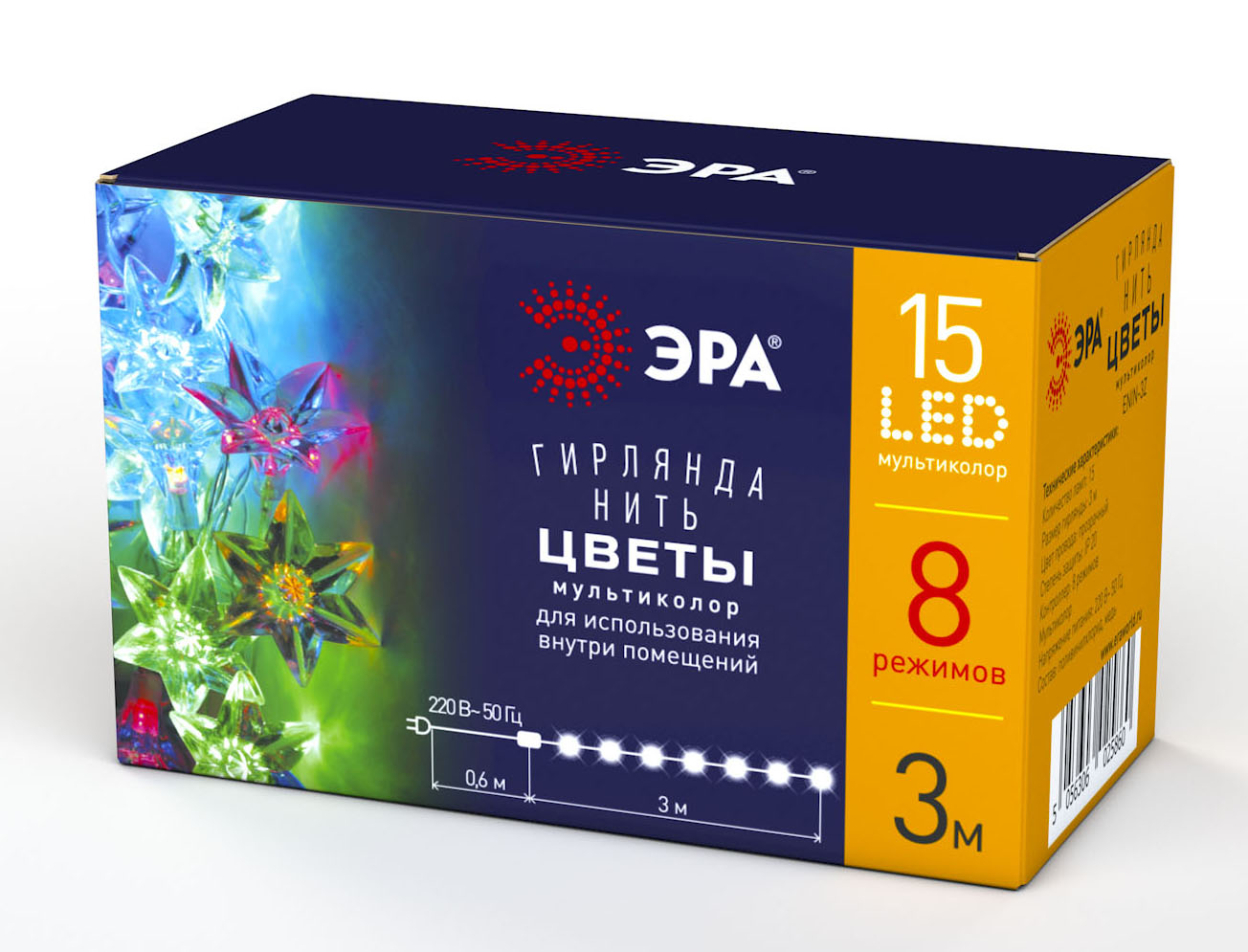 Новогодняя светодиодная гирлянда ЭРА (арт. Б0041896) с необычным исполнением ламп - они представляют собой разноцветные цветы-звёзды. На полупрозрачном проводе длиной 3 метра расположены 15 ламп с яркими экономичными светодиодами. Плафоны в форме цветков изготовлены из ударопрочного прозрачного пластика. Гирлянда выглядит оригинально и светит разнообразно - доступны 8 режимов под любое настроение: от тихого предновогоднего вечера в семейном кругу до шумной вечеринки в компании гостей. Украсите ваш дом, офис или общественное пространство быстро и красиво!