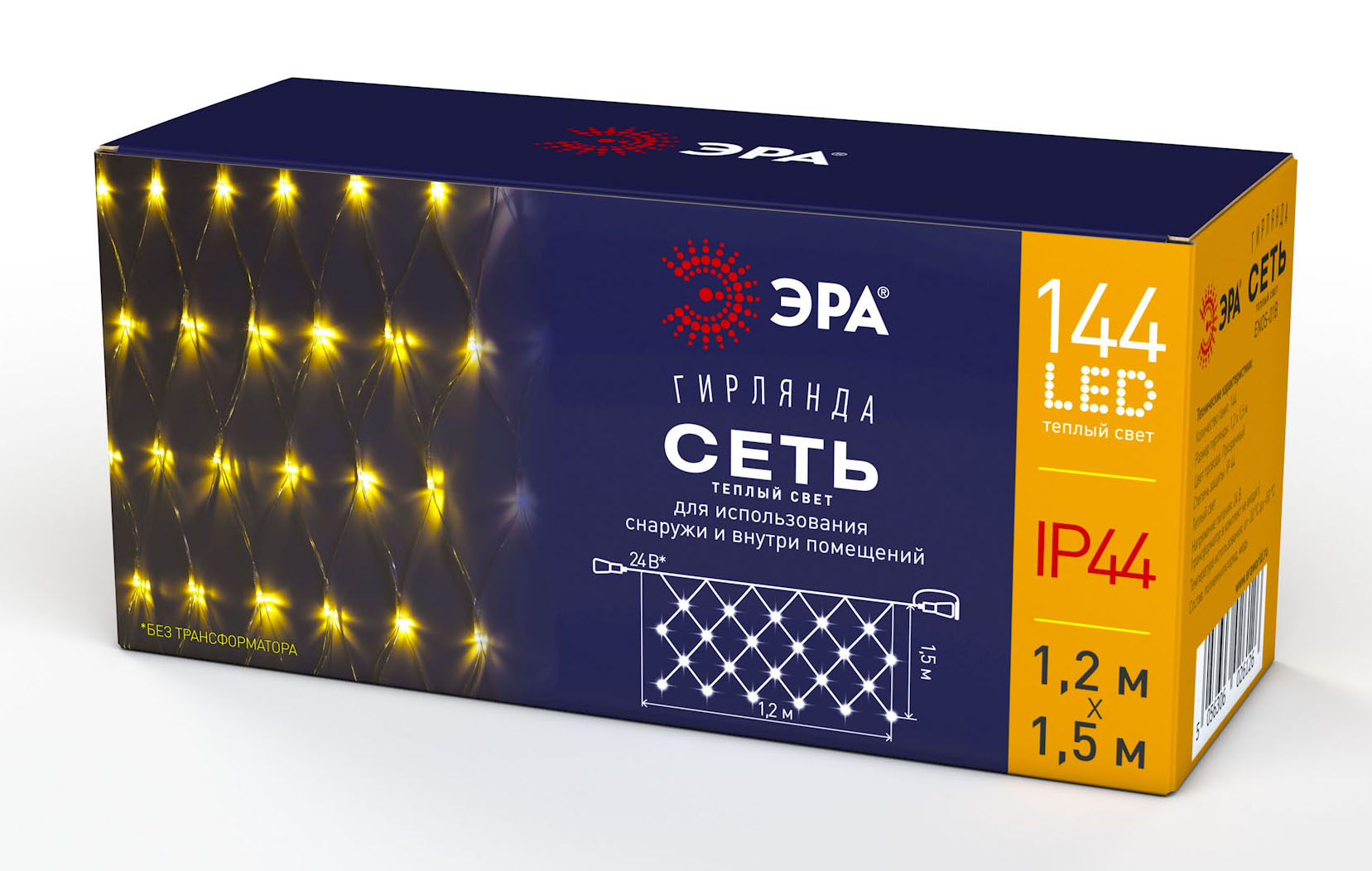 Праздничная светодиодная гирлянда ЭРА "Сеть" (арт. Б0041909) для использования внутри и снаружи помещений. Защищена от влаги и пыли (IP44), морозостойка - можно использовать на улице в регионах с низкими температурами. Идеальное решение для украшения окон, имеет оптимальные размеры: 1,2 х 1,5 м. На полупрозрачных малозаметных проводах размещены 144 ярких экономичных светодиода с уютным тёплым светом. Стильная аккуратная гирлянда ЭРА "Сеть" создаёт позитивное настроение и незабываемую атмосферу в доме, офисе, общественном пространстве. Применяется для новогодней иллюминации, оформления праздников, дизайна фотозон. Ещё одно преимущество - специальный разъём для сопряжения с другими гирляндами. Такая модульная конструкция позволяет соединять в единую цепь до 4 гирлянд ЭРА "Сеть", формируя длинный световой ряд для максимально эффектной иллюминации. Современная светодиодная технология экономит до 90% электроэнергии. Гирлянда отвечает требованиям пожарной безопасности, работает от трансформатора. Трансформатор ЭРА, преобразующий входное напряжение 210-240 В в выходное 24 В: http://www.eraworld.ru/catalog/2647679 (арт. Б0041911).