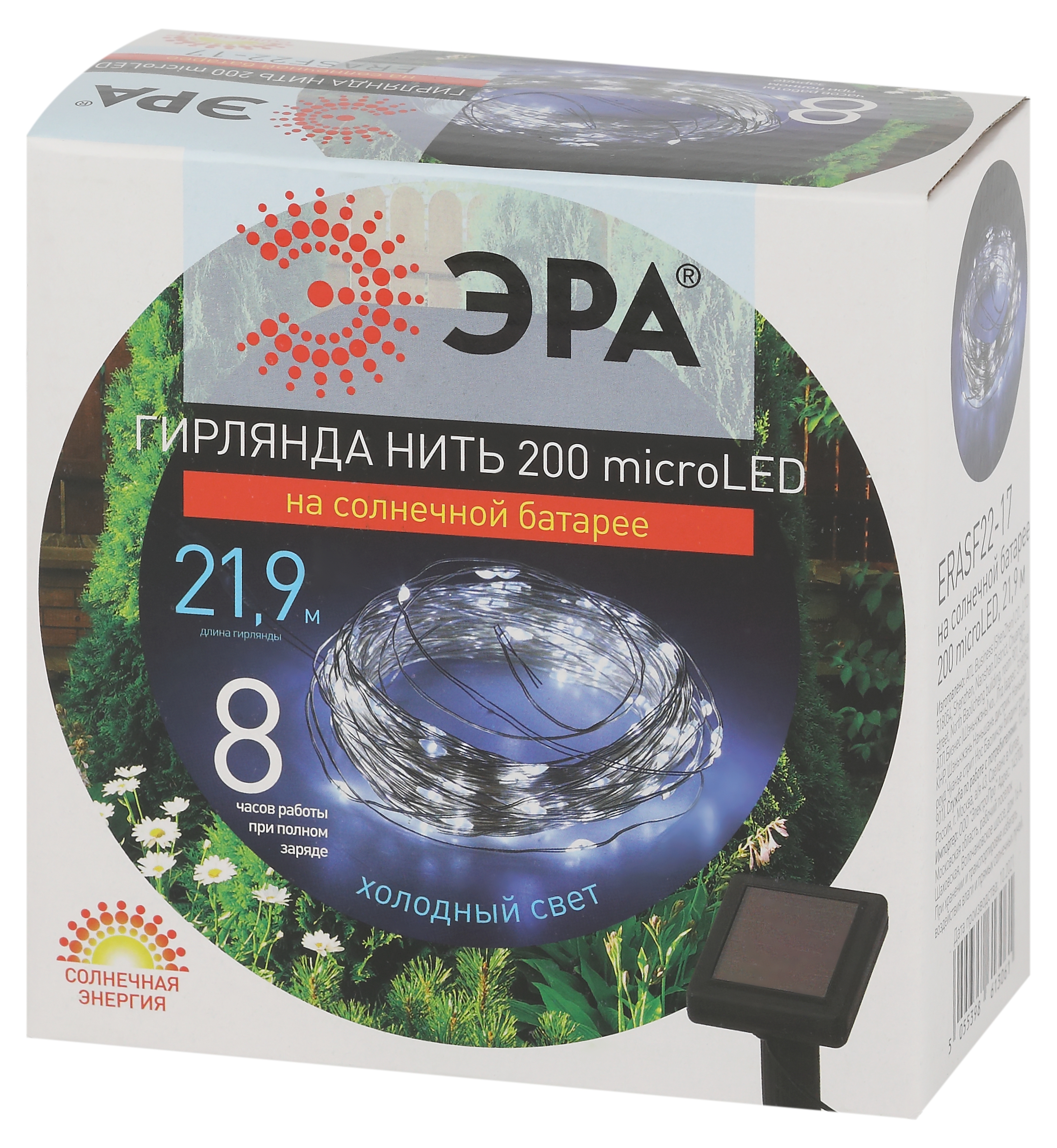 Садовая гирлянда ERASF22-17 Нить 21.9 м от компании ЭРА позволит украсить Ваш дачный участок или частный дом и расставить акценты! Эта уличная светодиодная гирлянда добавит атмосферу праздника - нарядите ей елку, кустарник, беседку, выделите ветви дерева или окно дома. Состоит из 200 microLED - маленьких светодиодов с холодным свечением. Гирлянда работает на солнечной батарее - данный способ получения энергии является очень экологичным, энергоемким, а также бесшумным. Питание происходит во включенном режиме, днем, а с наступлением темноты гирлянда автоматически включается, чтобы радовать Вас до 8 часов своим светом. Есть 2 режима - постоянный и мигающий - выбирайте под настроение. Садовый светильник может работать на улице в плохую погоду, благодаря высокой степени пыле- и влагозащиты IP44, убирать его не нужно. Уличная гирлянда на солнечной батарее ЭРА позволит сделать Вашу территорию уникальной и яркой!