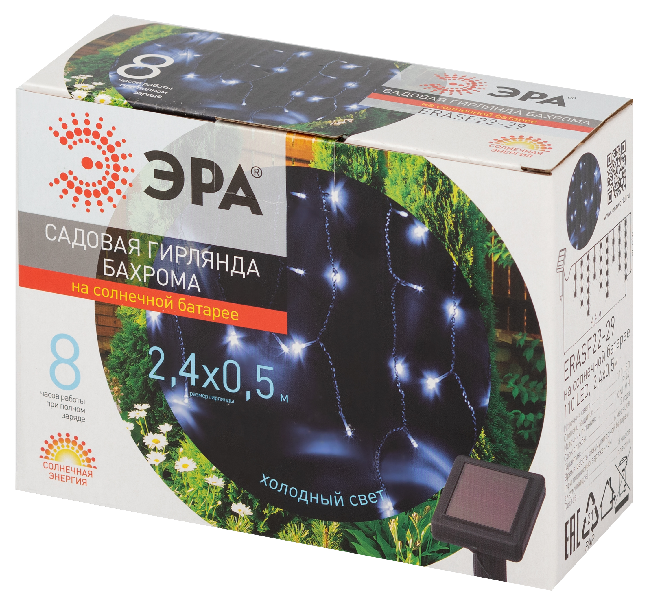 Гирлянда-бахрома ЭРА ERASF22-29 (арт. Б0053373) из светодиодных лампочек холодного белого свечения идеальна для декора беседки, веранды, фасада. 110 LED создают ровное яркое свечение, автоматически включаются с наступлением темноты. Длина гирлянды - 2,4 м, (длина провода - 2м, длина рабочей части - 2,4 м) высота бахромы - 0,5 м. Долговечная влагозащищённая гирлянда для сада - практичная покупка. Данная гирлянда уличная оснащена солнечной панелью, накапливающей энергию в течение светового дня, и не нуждается в подключении к электросети. Это значит, что гирлянду-бахрому ЭРА можно разместить в любои месте сада.