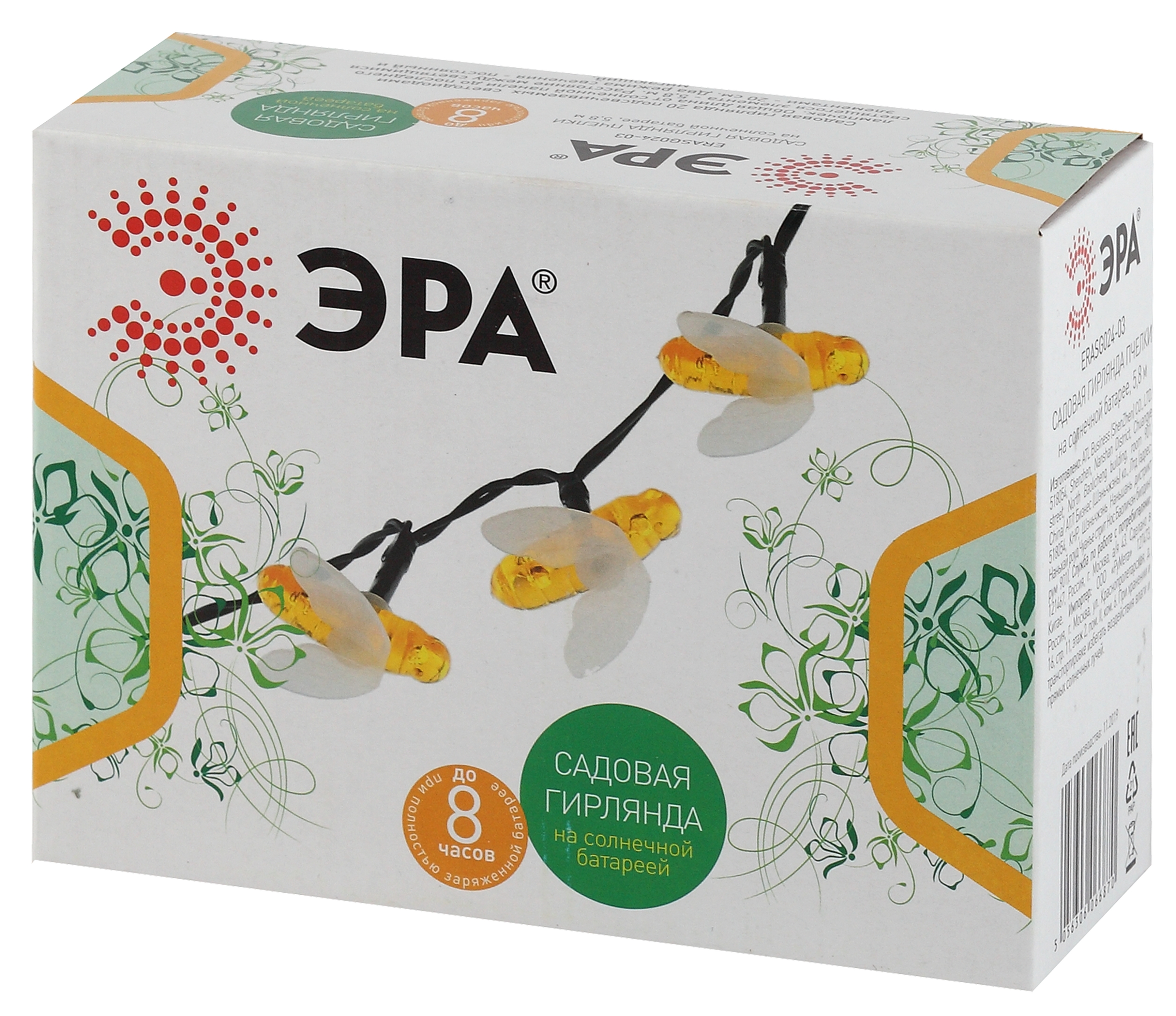 Уличная светодиодная гирлянда ERASG024-03 "Пчелки" станет ярким акцентом на Вашей дачной территории. Удобная конструкция и простая установка позволят Вам расположить гирлянду среди клумб, цветов и кустарников, красочно подсветить аллею, фасад здания или окно. Общая длина 5,8 м. Подсветка работает от солнечной батареи. Такой способ получения энергии является наиболее экологичным и энергоемким. Питание происходит во включенном режиме "ON". С наступлением темноты маленькие пчелки загораются. Их животики заливаются желтым светом, создавая веселую атмосферу. Подсветка улицы может длиться непрерывно в течение 8 часов. Высокая степень пыле и влагозащиты позволяет оставлять светильник на улице даже во время дождя. Обращаем Ваше внимание, что перед использованием фигурки её необходимо включить и зарядить. Светильник заряжается в течение всего светового дня. Создавайте уникальное вместе с гирляндой "Пчелки" на солнечной батарее от производителя ЭРА!