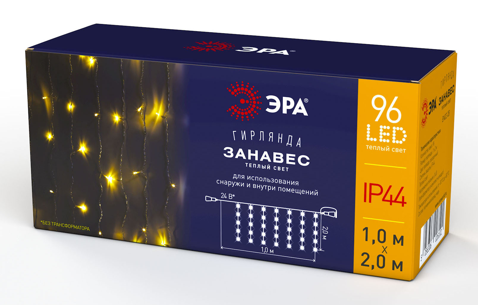 Праздничная светодиодная гирлянда ЭРА "Занавес" для использования внутри и снаружи помещений. Защищена от влаги и пыли (IP44), морозостойка - можно использовать на улице в регионах с низкими температурами. Идеальное решение для украшения окон, имеет оптимальные размеры: 2 х 2 м. На полупрозрачных малозаметных проводах размещены 96 ярких экономичных светодиодов с уютным тёплым светом. Стильная аккуратная гирлянда ЭРА "Занавес" создаёт позитивное настроение и незабываемую атмосферу в доме, офисе, общественном пространстве. Применяется для новогодней иллюминации, оформления праздников, дизайна фотозон. Ещё одно преимущество - специальный разъём для сопряжения с другими гирляндами. Такая модульная конструкция позволяет соединять в единую цепь до 5 гирлянд ЭРА "Занавес", формируя длинный световой ряд для максимально эффектной иллюминации. Современная светодиодная технология экономит до 90% электроэнергии. Гирлянда отвечает требованиям пожарной безопасности, работает от трансформатора. Трансформатор ЭРА, преобразующий входное напряжение 210-240 вольт в выходное 24 В: http://www.eraworld.ru/catalog/2647679