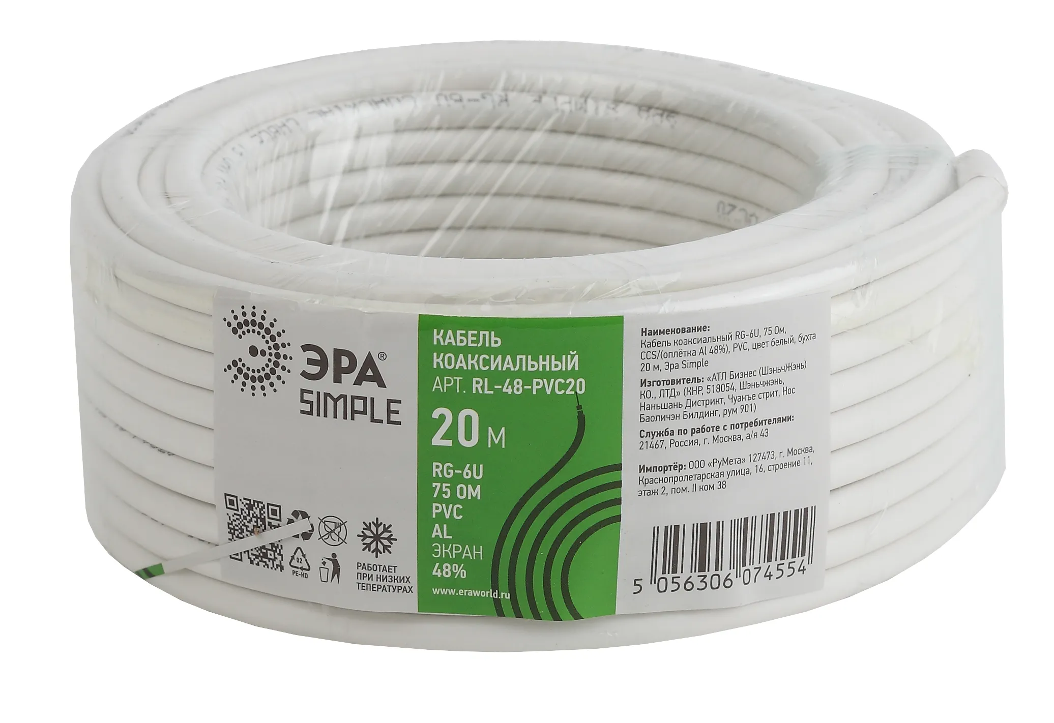 Кабель коаксиальный Эра SIMPLE RG-6U, 75 Ом, CCS предназначен для применения в системах кабельного и спутникового телевидения, видеонаблюдения, систем связи. Для прокладки внутри и вне помещений при условии защиты от осадков и солнечного излучения.