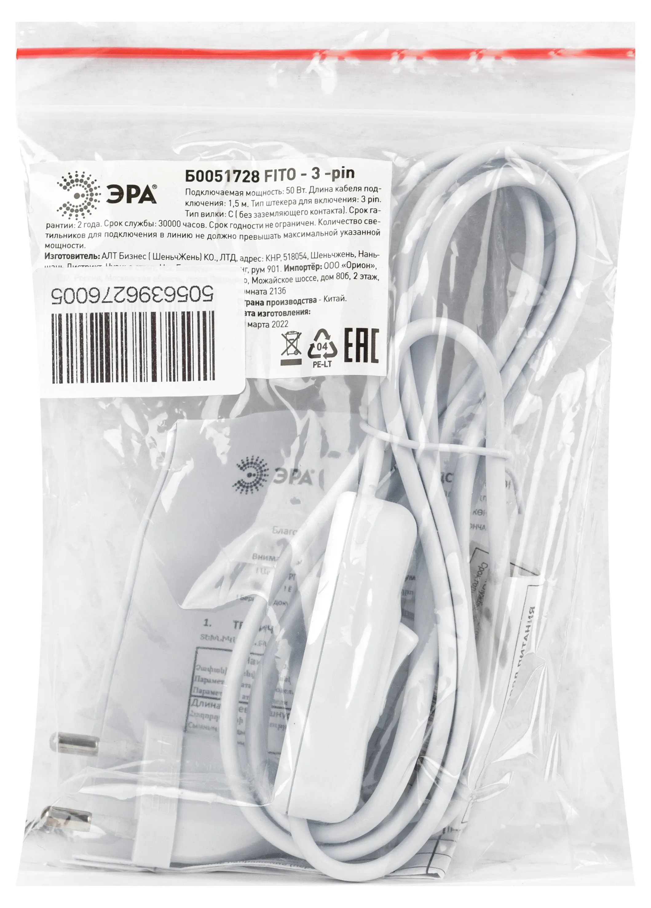 ЭРА Fito-3-pin — провод с кнопочным выключателем для подключения фитосветильников. Выполнен из качественных материалов, подходит для фитосветильников серий ЭРА FITO Т5-N и ЭРА Т5-Ra90. Отличается оптимальной длиной — 1,5 метра.
