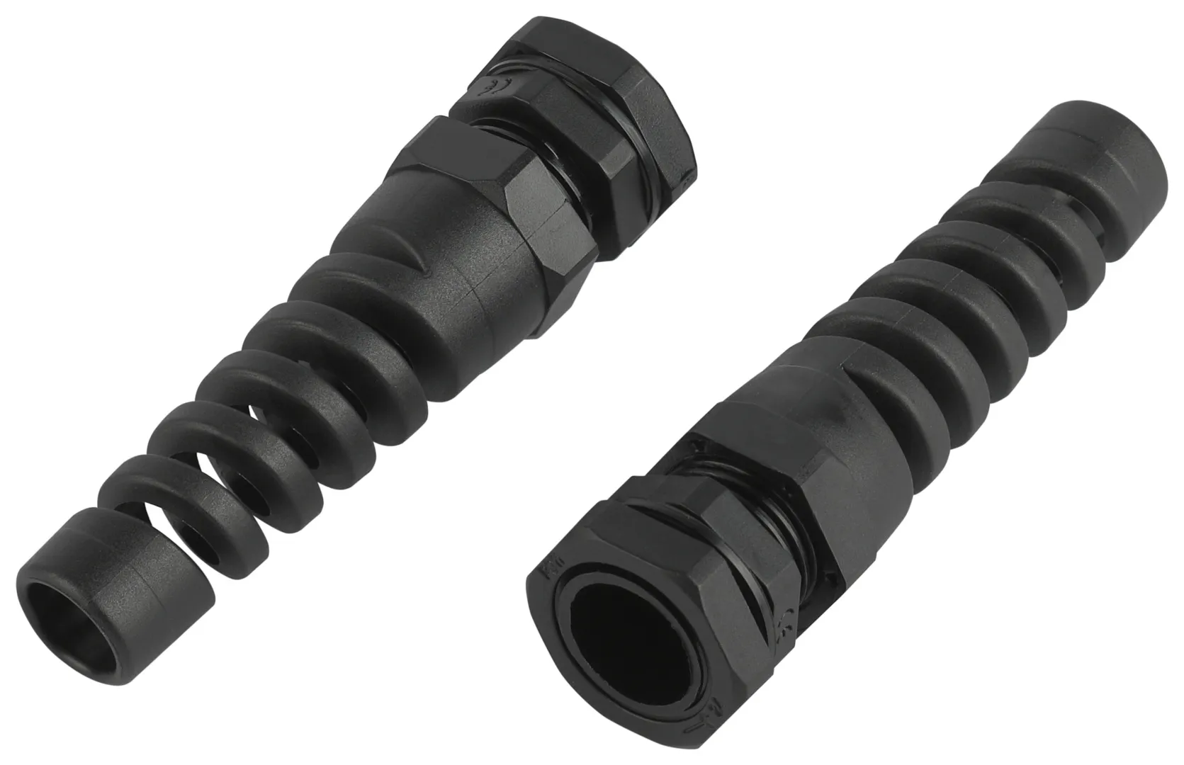 Кабельные вводы (сальники) PGR позволяют создавать безопасный и долговечный ввод электрических проводников в распределительные щиты, монтажные коробки и электроустановки. Устанавливаются в местах ввода-вывода проводников в электроустановку при помощи трубного (газового) ключа и защищают от проникновения вовнутрь пыли и влаги, а также защищают проводники от механических повреждений. Кабельные вводы (сальники) c гибким отводом серии PGR состоят из гайки-фиксатора, уплотнительного кольца, корпуса, фиксирующего зажима, сальника и прокладки, спирального гибкого отвода. Удлиненный спиралевидный отвод служит для защиты проводника от перегибов и механических повреждений в месте ввода-вывода. Устанавливаются в местах ввода-вывода проводников в электроустановку и защищают от проникновения вовнутрь пыли и влаги по стандарту IP54. Особенности конструкции: · Степень защиты IP54 · Тип резьбы: PG-дюймовая электроарматурная по DIN 40430 · Спиральный гибкий отвод предотвращает надлом проводника в месте соединения с оболочкой. · Стойкость к синтетическим маслам и всем видам топлива · Конструкция прижимной гайки имеет специальные стопорные засечки, предотвращающие раскручивание · На прижимной гайке нанесена маркировка размера ключа · Материал корпуса и прижимной гайки: нейлон, не поддерживает горение, не содержит галогенов по UL94V2, устойчив к UV-излучению · Материал уплотнителя и прокладки: неопрен