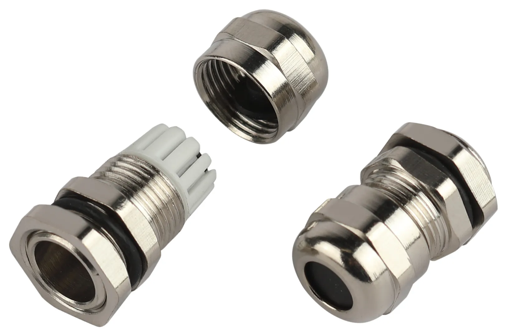 Кабельные вводы (сальники) PGM позволяют создавать безопасный и долговечный ввод электрических проводников в распределительные щиты, монтажные коробки и электроустановки. Устанавливаются в местах ввода-вывода проводников в электроустановку при помощи трубного (газового) ключа и защищают от проникновения вовнутрь пыли и влаги, а также защищают проводники от механических повреждений. Кабельные вводы (сальники) латунные серии PGM состоят из гайки-фиксатора, уплотнительного кольца, корпуса, фиксирующего зажима, зажимной гайки, уплотнительного элемента с защитной мембраной. Устанавливаются в комплексных оболочках (сборки, шкафы, распределительные коробки и пр.) для достижения степени защиты IP68. Благодаря латунному корпусу и антикоррозионному никелированному покрытию обладают особой прочностью, долговечностью и устойчивостью к агрессивным воздействиям внешней среды. Особенности конструкции: · Степень защиты IP68. · Тип резьбы: PG-дюймовая электроарматурная по DIN 40430. · Установлена защитная мембрана для защиты от попадания влаги и пыли. · Повышенная стойкость к агрессивным средам: синтетическим маслам и всем видам топлива, морскому климату, радиации, высоким температурам, кислотам, жирам, растворителям. · Материал корпуса и прижимной и накидной гаек: никелированная латунь. · Материал зубчатой муфты: нейлон 6.6, не поддерживает горение, не содержит галогенов по UL94V2.