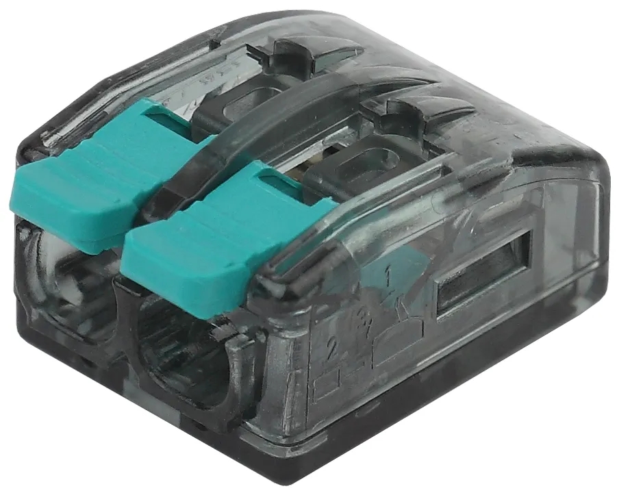 Клеммы СМК компактная с плоско-пружинным зажимом предназначены для многоразового присоединения и ответвления одножильных и многожильных проводников из меди в электрических цепях переменного тока с частотой 50 Гц напряжением до 400 В. Клемма имеет более компактные размеры в сравнении с привычными ручейковыми клеммами, прозрачный корпус позволяет контролировать контакт проводников с контактными пластинами. Корпус клемм изготовлен из самозатухающего пластика, монтаж не требует использования инструментов. Подходит для многоразового использования. При монтаже необходимо снять изоляцию с проводников в соответствии с обозначениями на корпусе клеммы. Поднимите рычажок, вставите проводник в гнездо, опустите рычажок в исходное положение.