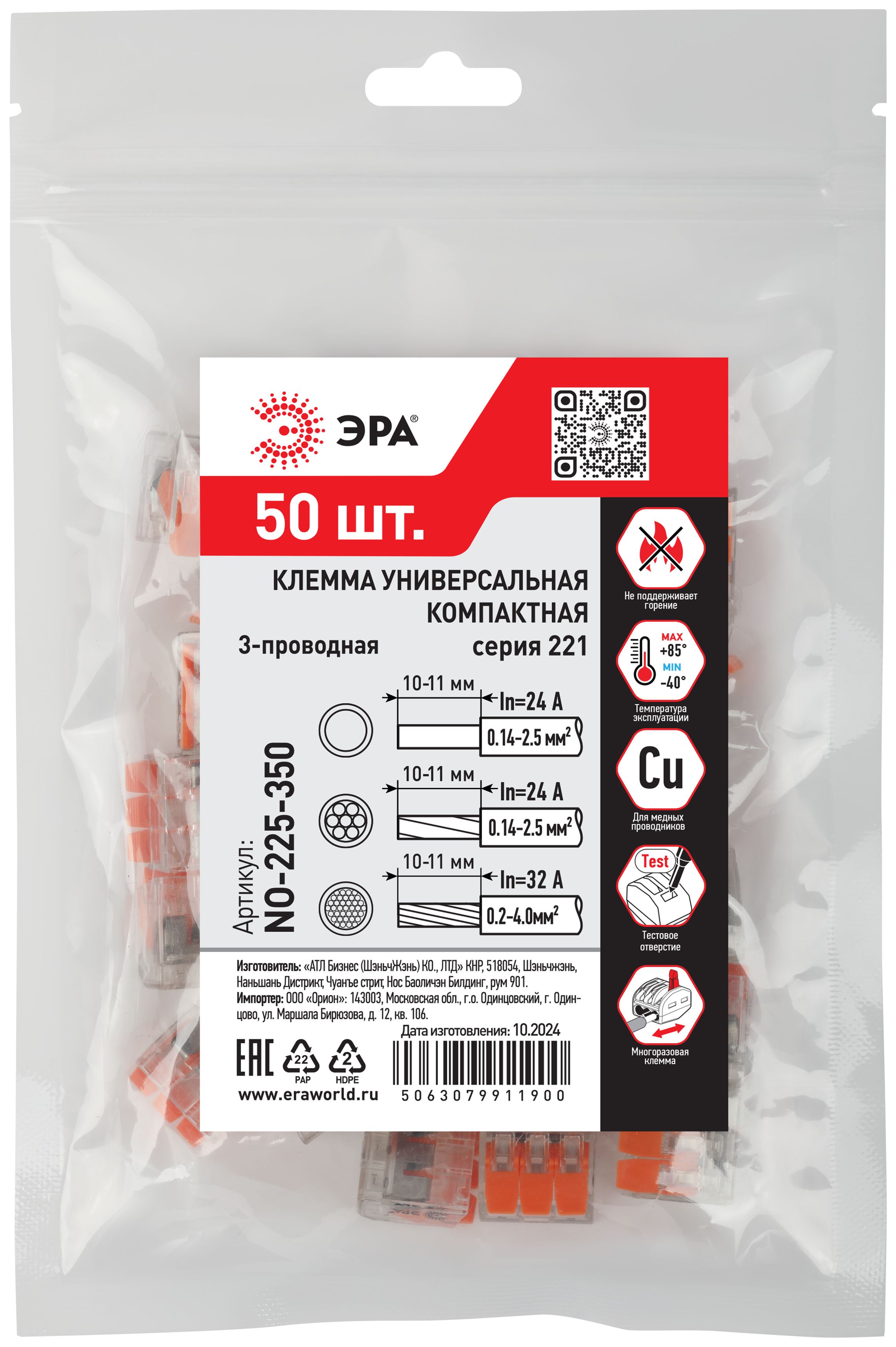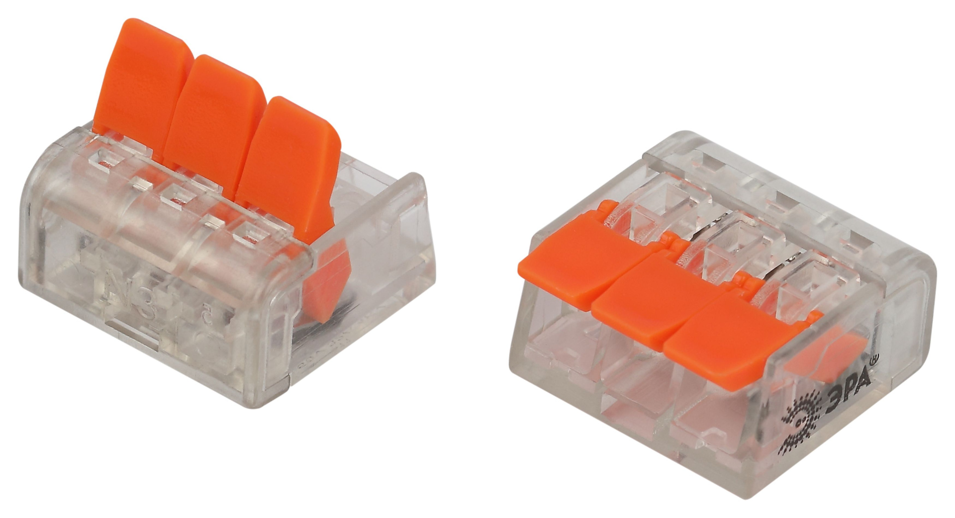 Универсальные компактные клеммы 221 серии с рычагами ЭРА предназначены для многократного соединения всех типов проводников (медных одножильных и многожильных, оконцованных втулочными наконечниками НШвИ) без использования специального инструмента. При подсоединении проводников с изолированными наконечниками НШвИ их макс. сечение должно быть на один размер меньше максимального сечения клеммы.