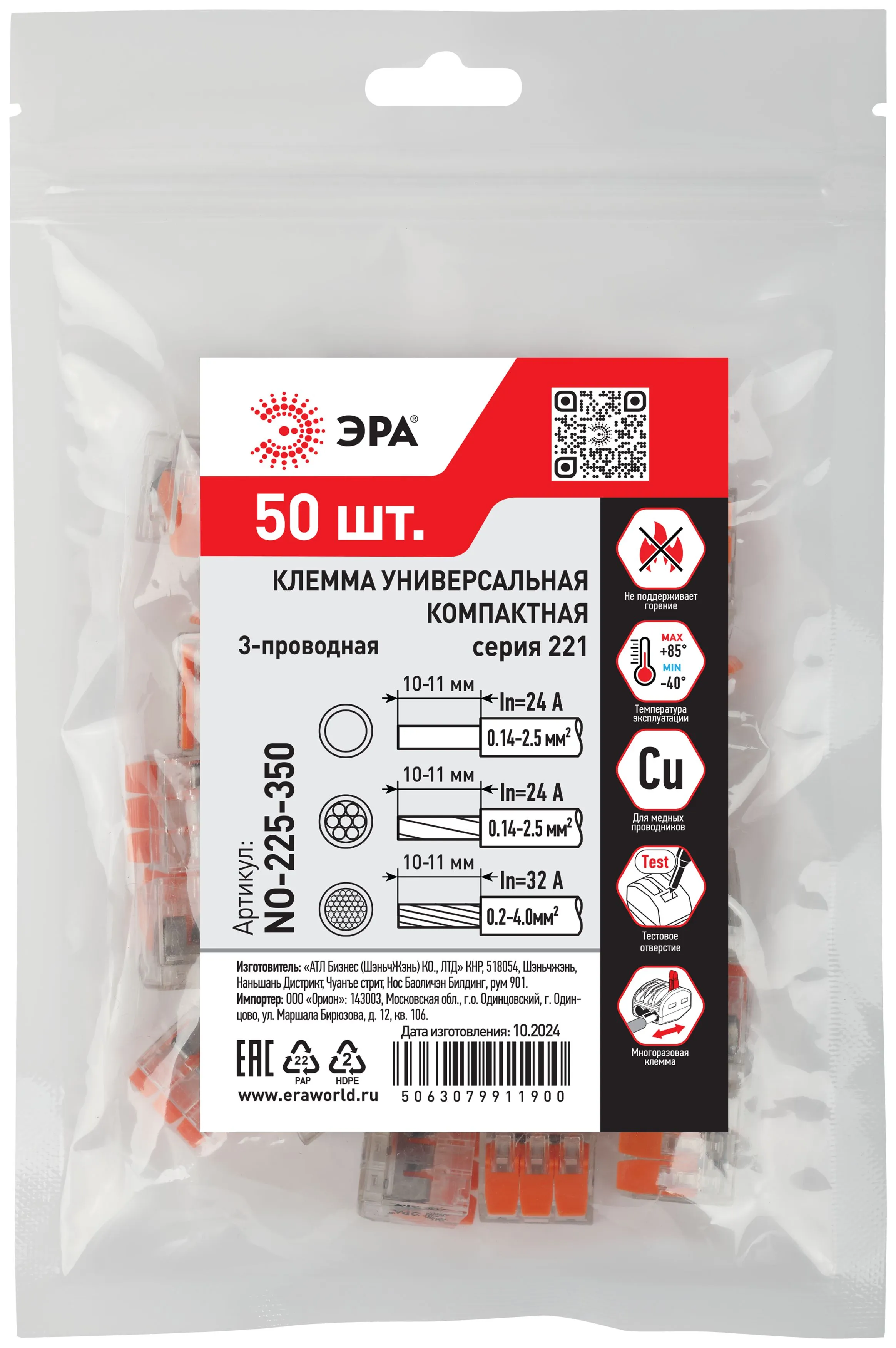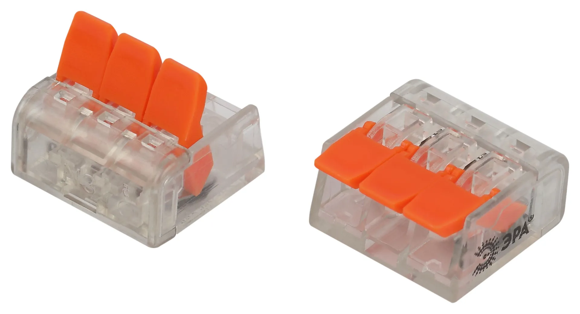 Универсальные компактные клеммы 221 серии с рычагами ЭРА предназначены для многократного соединения всех типов проводников (медных одножильных и многожильных, оконцованных втулочными наконечниками НШвИ) без использования специального инструмента. При подсоединении проводников с изолированными наконечниками НШвИ их макс. сечение должно быть на один размер меньше максимального сечения клеммы. Применяются для соединения и разводки проводников в распределительных коробках, а также для подключения осветительного и другого электрооборудования в условиях ограниченного пространства. Использование универсальных клемм с рычагами позволяет: - создать надёжное и долговременное соединение проводов за счёт механизма, управляемой рычагами. - получить возможность легко и быстро отсоединить провода, изменить схему, подключить дополнительную цепь или устройство. - оперативно соединять или наращивать провода, сделанные из разных материалов и разного сечения. - сэкономить место в распределительной коробке или щитке. Особенности конструкции: - конструкция механизма с широкими рычажками обеспечивает многоразовый монтаж и демонтаж всех типов медных проводников: одножильных, многожильных и тонкопроволочных. - специально подобранное исходное положение рычага исключает случайное разъединение подключённого проводника. - компактный корпус поможет сэкономить до 40% пространства по сравнению с 222-й серией, упрощает работу в ограниченном пространстве. - изделия обладают тестовыми отверстиями, которые дают возможность измерения электрических параметров цепи соединения. - прозрачный корпус выполнен из поликарбоната и не поддерживает горение, что позволяет визуально контролировать длину зачистки изоляции и состояние контакта. - контактная часть выполнена из лужёной латуни с высоким содержанием меди. - прижимной механизм изготовлен из высококачественной легированной пружинной стали.