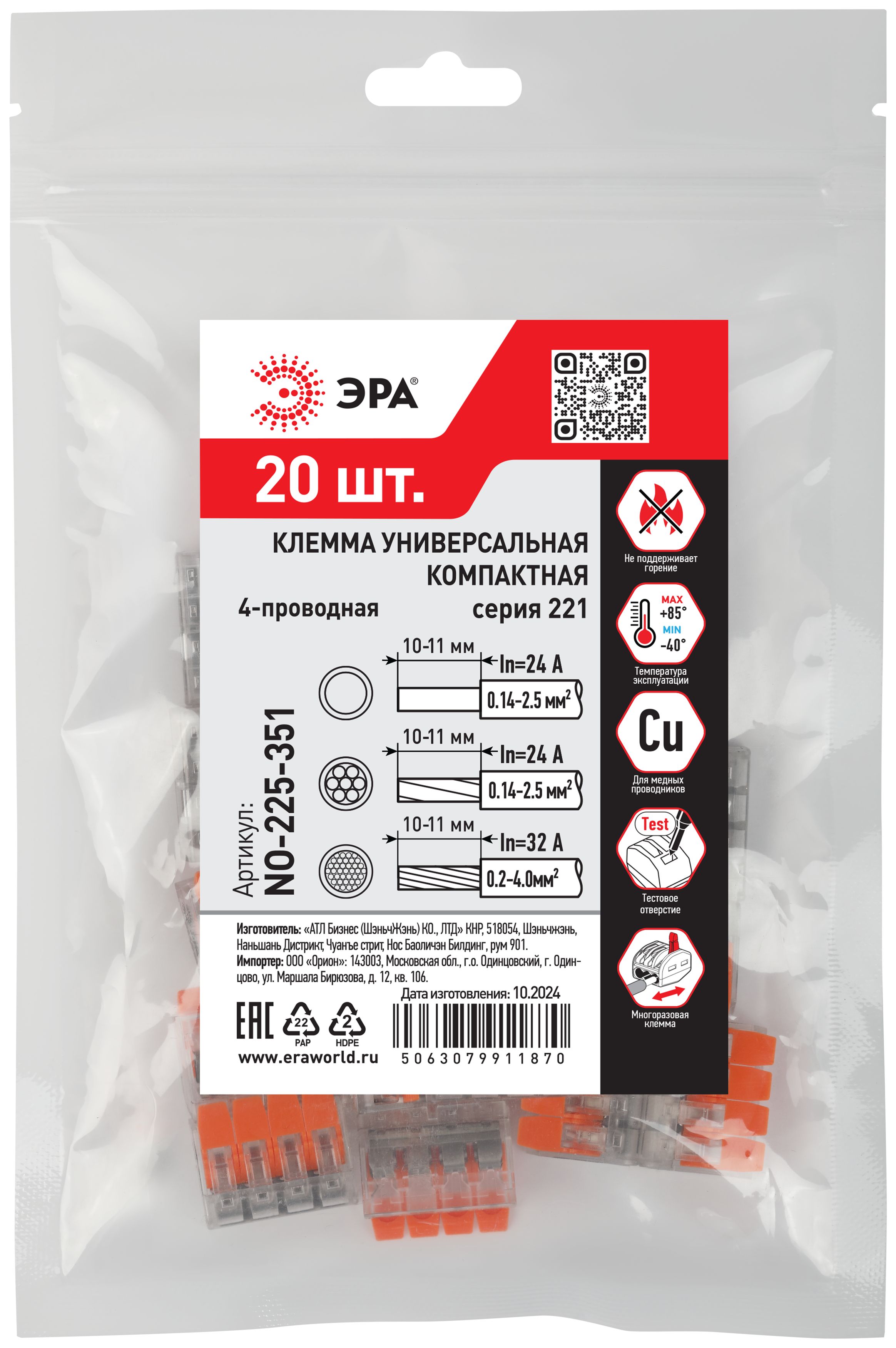 Универсальные компактные клеммы 221 серии с рычагами ЭРА предназначены для многократного соединения всех типов проводников (медных одножильных и многожильных, оконцованных втулочными наконечниками НШвИ) без использования специального инструмента. При подсоединении проводников с изолированными наконечниками НШвИ их макс. сечение должно быть на один размер меньше максимального сечения клеммы.