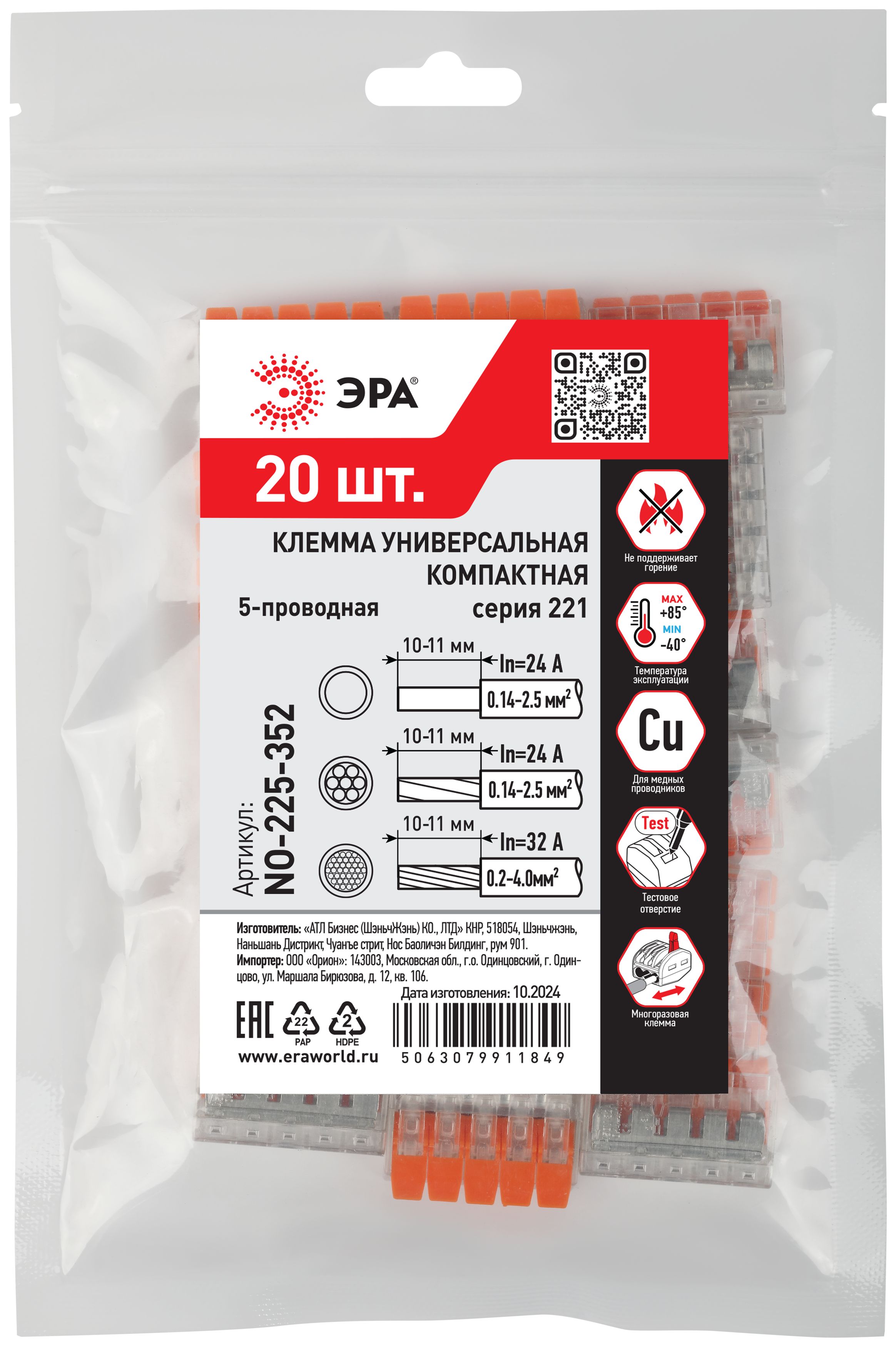 Универсальные компактные клеммы 221 серии с рычагами ЭРА предназначены для многократного соединения всех типов проводников (медных одножильных и многожильных, оконцованных втулочными наконечниками НШвИ) без использования специального инструмента. При подсоединении проводников с изолированными наконечниками НШвИ их макс. сечение должно быть на один размер меньше максимального сечения клеммы.
