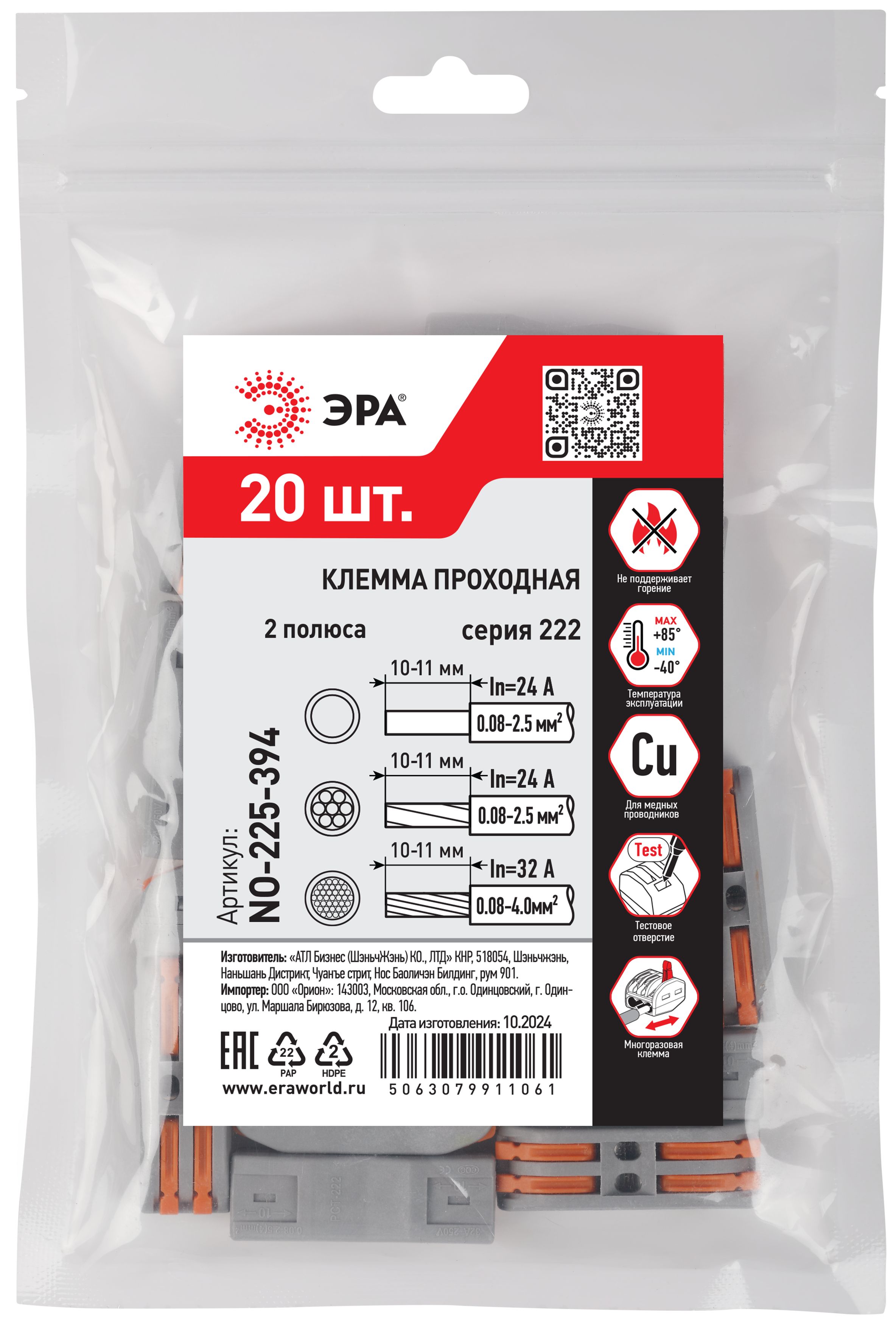 Универсальные проходные клеммы 222 серии с рычагами ЭРА предназначены для создания многократных соединений всех типов проводников (медных одножильных и многожильных, оконцованных втулочными наконечниками НШвИ) без использования специального инструмента. При подсоединении проводников с изолированными наконечниками НШвИ их максимальное сечение должно быть на один размер меньше максимального сечения клеммы.