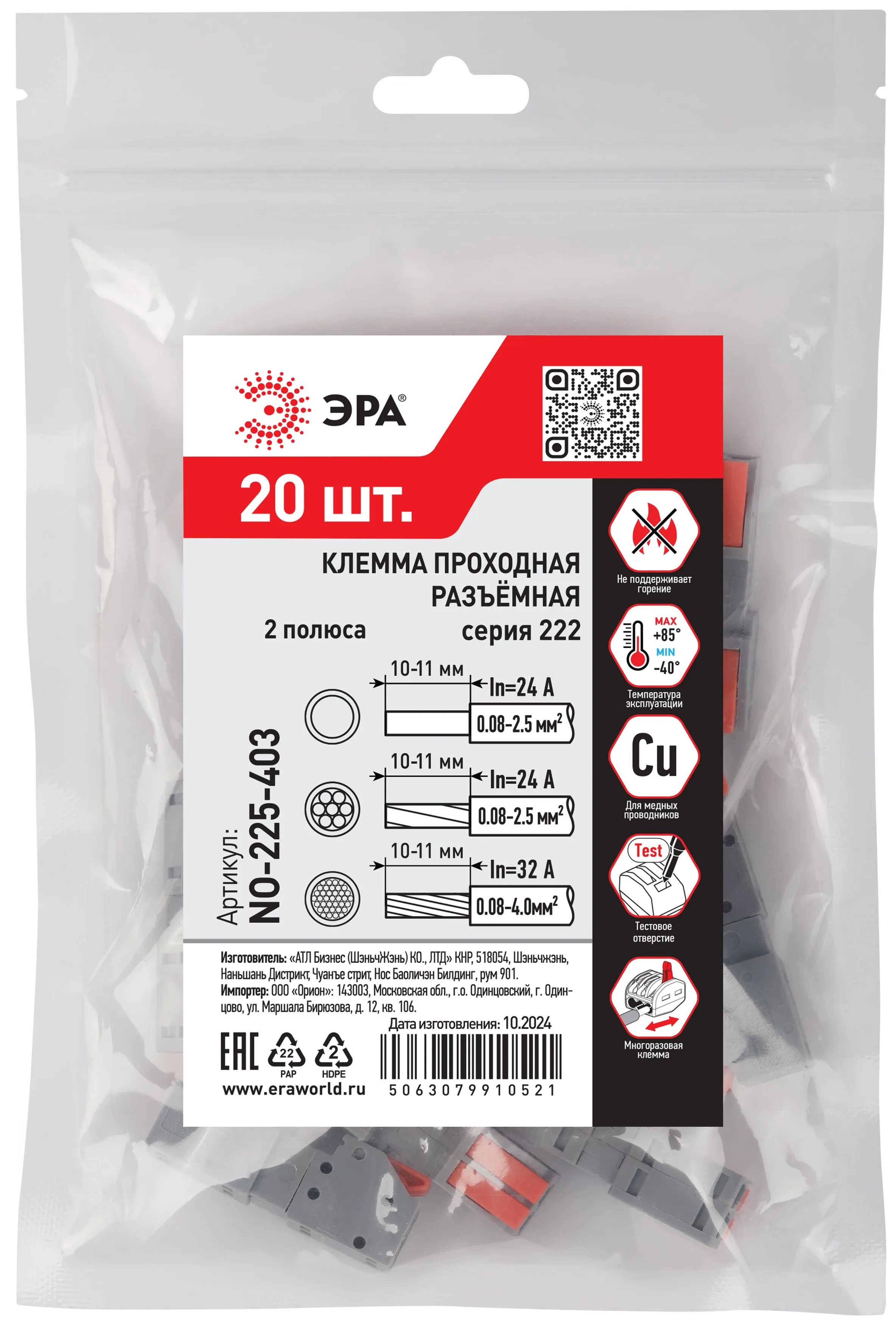 Универсальные проходные разъёмные клеммы 222 серии с рычагами ЭРА предназначены для создания многократных разъёмных соединений всех типов проводников (медных одножильных и многожильных, оконцованных втулочными наконечниками НШвИ) без использования специального инструмента. Применяются для организации быстроразъёмного проходного соединения в случаях, когда требуется оперативное размыкание цепи без необходимости извлечения проводников из клеммных зажимов. Использование универсальных разъёмных проходных клемм позволяет: - создать безопасное быстроразъёмное проходное соединение, при этот нет необходимости отключать цепь от источника питания. - получить возможность легко и быстро отсоединить провода, изменить схему, переключить питание на другую цепь или устройство. - оперативно соединять или наращивать провода, сделанные из разных материалов и разного сечения. Особенности конструкции: - конструкция механизма с рычажками обеспечивает многоразовый монтаж и демонтаж всех типов медных проводников сечением до 4.0 мм2: одножильных, многожильных и тонкопроволочных. - конструкции корпуса выполнена из двух частей в виде разъёмного механизма. - специально подобранное исходное положение рычага исключает случайное разъединение подключённого проводника. - изделия обладают тестовыми отверстиями, которые дают возможность измерения электрических параметров цепи соединения. - корпус выполнен из полиамида 6.6. Не поддерживает горение, не содержит галогенов по UL94V2. - в состав контактной части входит лужёная латунь с высоким содержанием меди, что гарантирует хорошую электропроводность и низкий нагрев клеммы. - прижимной механизм изготовлен из высококачественной легированной пружинной стали, обеспечивая надежный зажим проводника и стабильность характеристик при многократном использовании.
