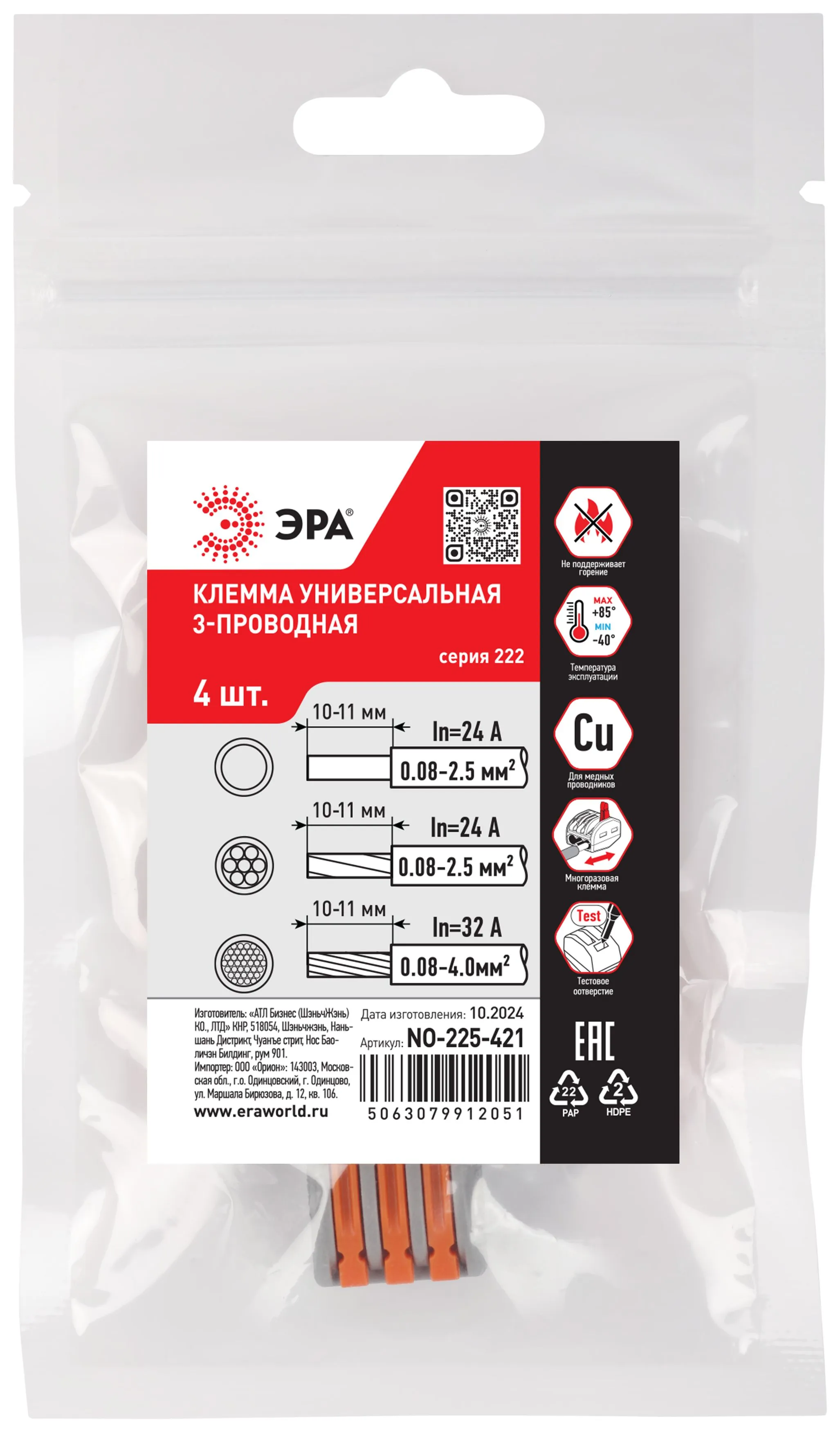 Универсальные клеммы 222 серии с рычагами ЭРА предназначены для многократного соединения всех типов проводников (медных одножильных и многожильных, оконцованных втулочными наконечниками НШвИ) без использования специального инструмента. При подсоединении проводников с изолированными наконечниками НШвИ их макс. сечение должно быть на один размер меньше максимального сечения клеммы. Применяются для соединения и разводки проводников в распределительных коробках, а также для подключения осветительного и другого электрооборудования. Использование универсальных клемм с рычагами позволяет: - создать надёжное и долговременное соединение проводов за счёт механизма пружинной клеммы, управляемой рычагами. - получить возможность легко и быстро отсоединить провода, изменить схему, подключить дополнительную цепь или устройство. - оперативно соединять или наращивать провода, сделанные из разных материалов и разного сечения. В случае применения клемм вне помещений, необходимо размещать их в герметичных монтажных коробках со степенью защиты не менее IP65. Особенности конструкции: - конструкция механизма с рычажками обеспечивает многоразовый монтаж и демонтаж всех типов медных проводников: одножильных, многожильных и тонкопроволочных. - специально подобранное исходное положение рычага исключает случайное разъединение подключённого проводника. - изделия обладают тестовыми отверстиями, которые дают возможность измерения электрических параметров цепи соединения. - корпус выполнен из полиамида 6.6. Не поддерживает горение, не содержит галогенов по UL94V2. - в состав контактной части входит лужёная латунь с высоким содержанием меди, что гарантирует хорошую электропроводность и низкий нагрев клеммы. - прижимной механизм изготовлен из высококачественной легированной пружинной стали, обеспечивая надежный зажим проводника и стабильность характеристик при многократном использовании.