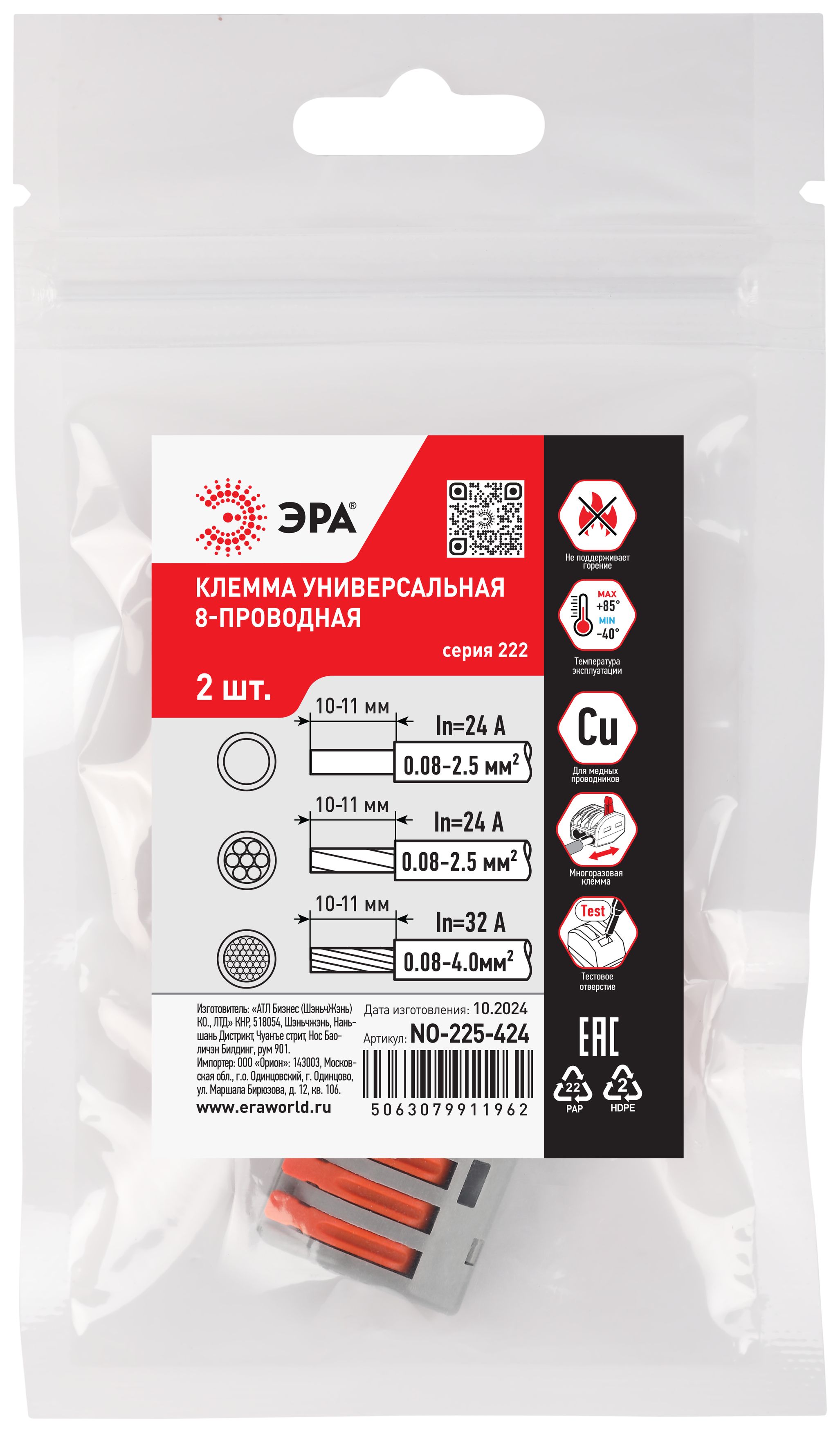 Универсальные клеммы 222 серии с рычагами ЭРА предназначены для многократного соединения всех типов проводников (медных одножильных и многожильных, оконцованных втулочными наконечниками НШвИ) без использования специального инструмента. При подсоединении проводников с изолированными наконечниками НШвИ их макс. сечение должно быть на один размер меньше максимального сечения клеммы.