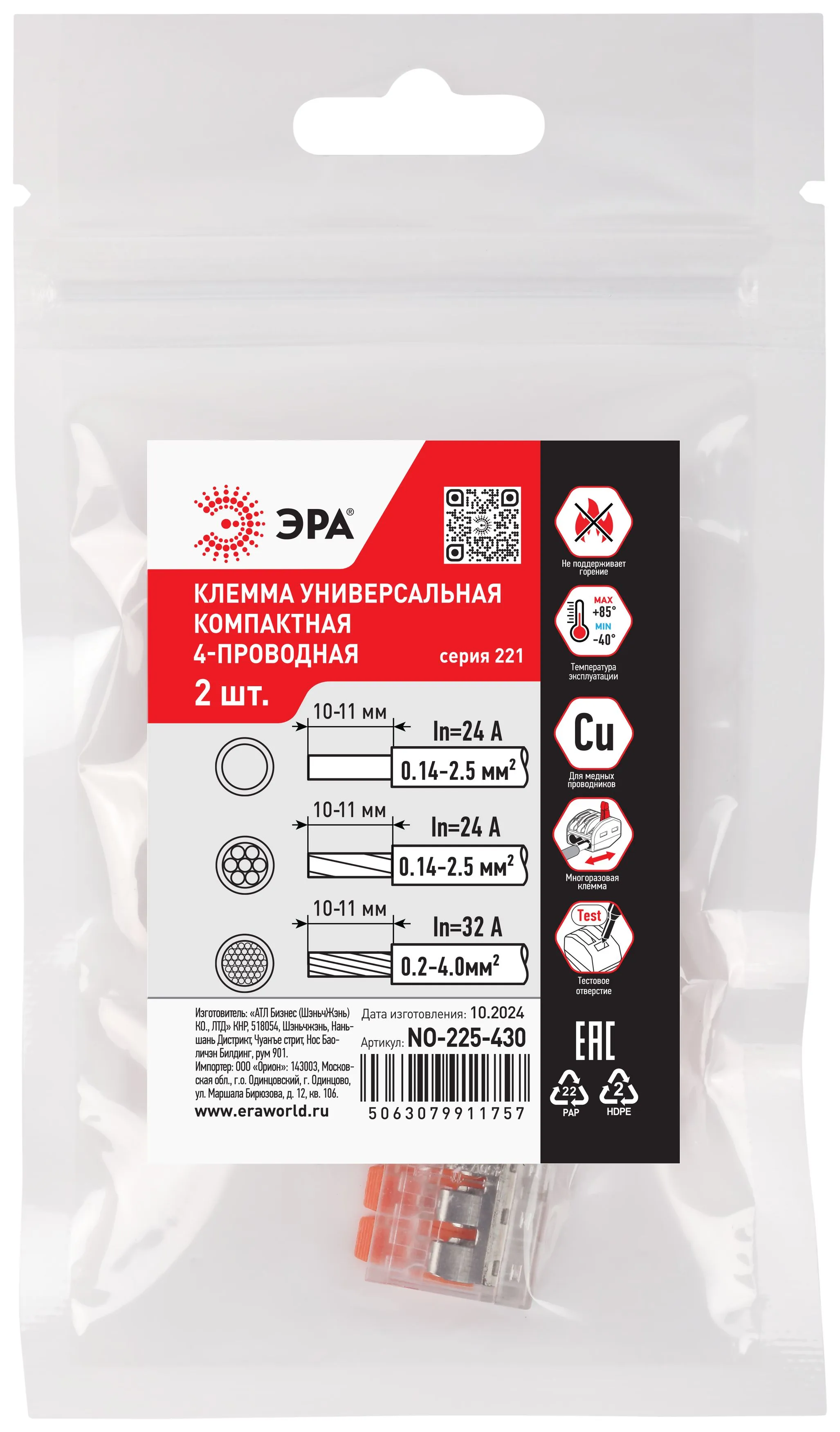 Универсальные компактные клеммы 221 серии с рычагами ЭРА предназначены для многократного соединения всех типов проводников (медных одножильных и многожильных, оконцованных втулочными наконечниками НШвИ) без использования специального инструмента. При подсоединении проводников с изолированными наконечниками НШвИ их макс. сечение должно быть на один размер меньше максимального сечения клеммы.