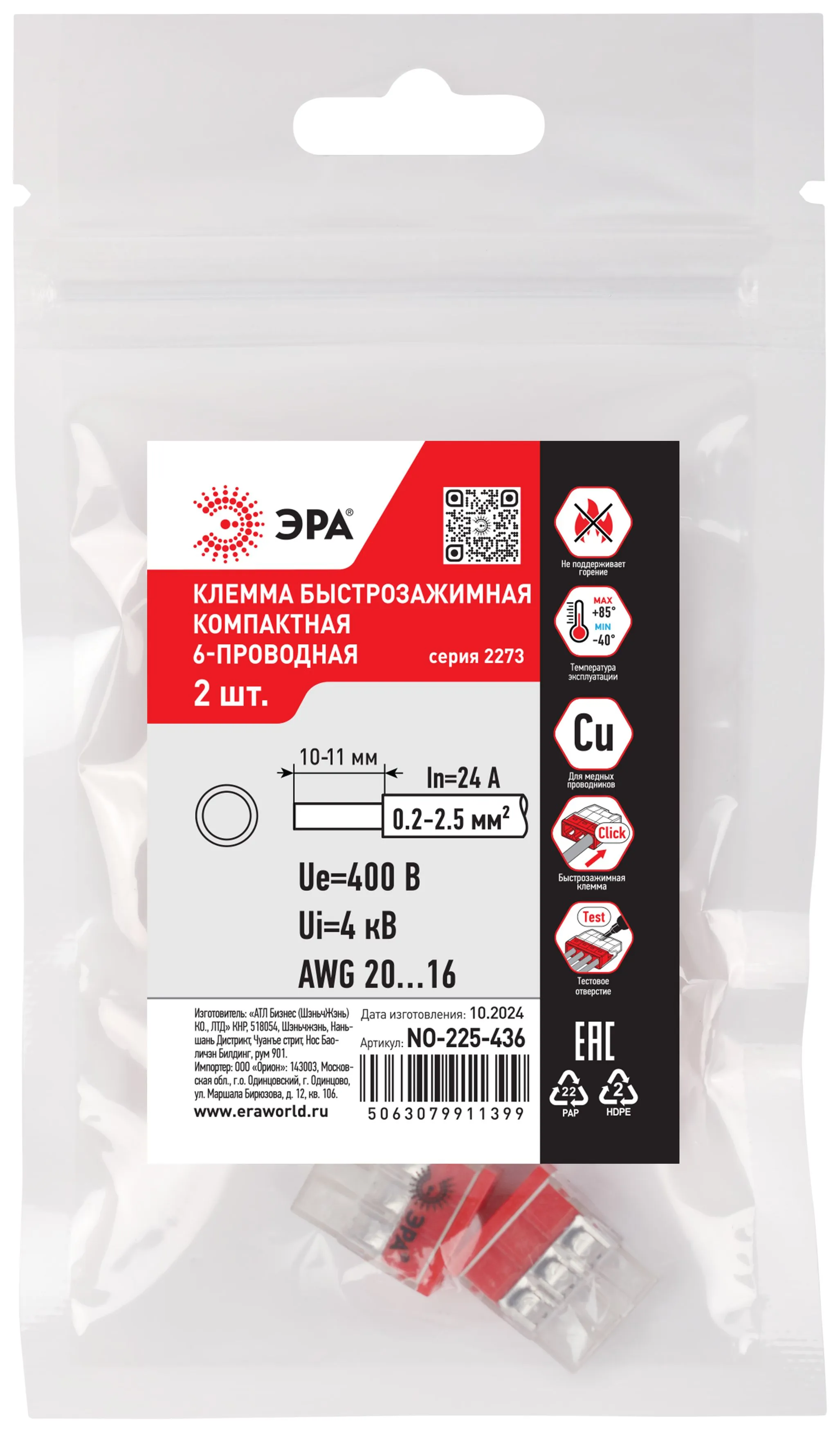Быстрозажимные компактные клеммы 2273 серии ЭРА предназначены для однократного подключения медных одножильных проводников без использования специального инструмента. Применяются для быстрого и удобного соединения и разводки проводников в распределительных коробках, а также для подключения осветительного и другого электрооборудования в условиях ограниченного пространства.
