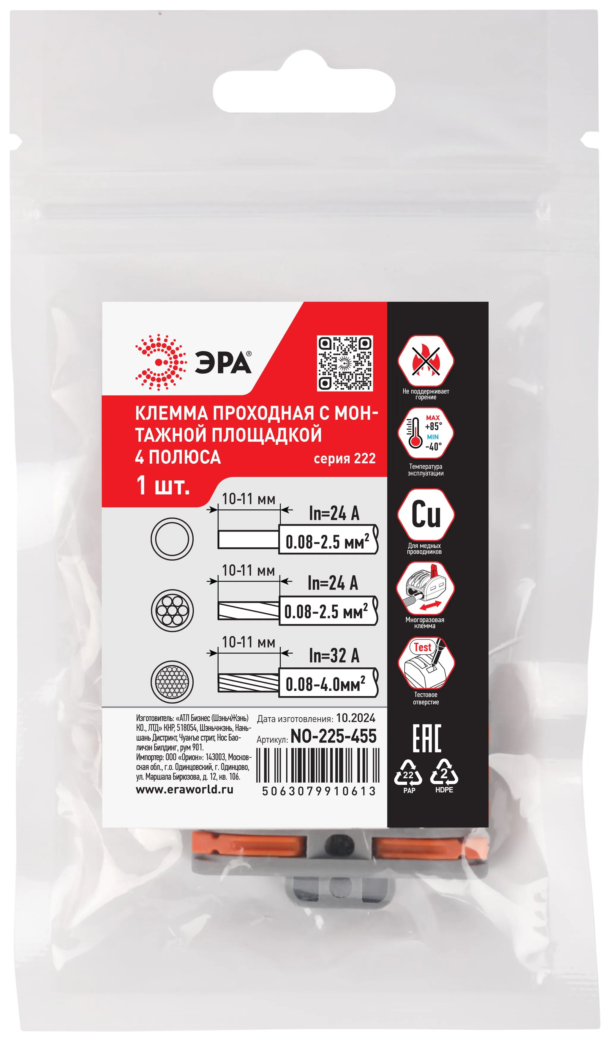 Универсальные проходные клеммы с монтажной площадкой 222 серии с рычагами ЭРА предназначены для создания многократных соединений всех типов проводников (медных одножильных и многожильных, оконцованных втулочными наконечниками НШвИ) без использования специального инструмента. При подсоединении проводников с изолированными наконечниками НШвИ их макс. сечение должно быть на один размер меньше максимального сечения клеммы.