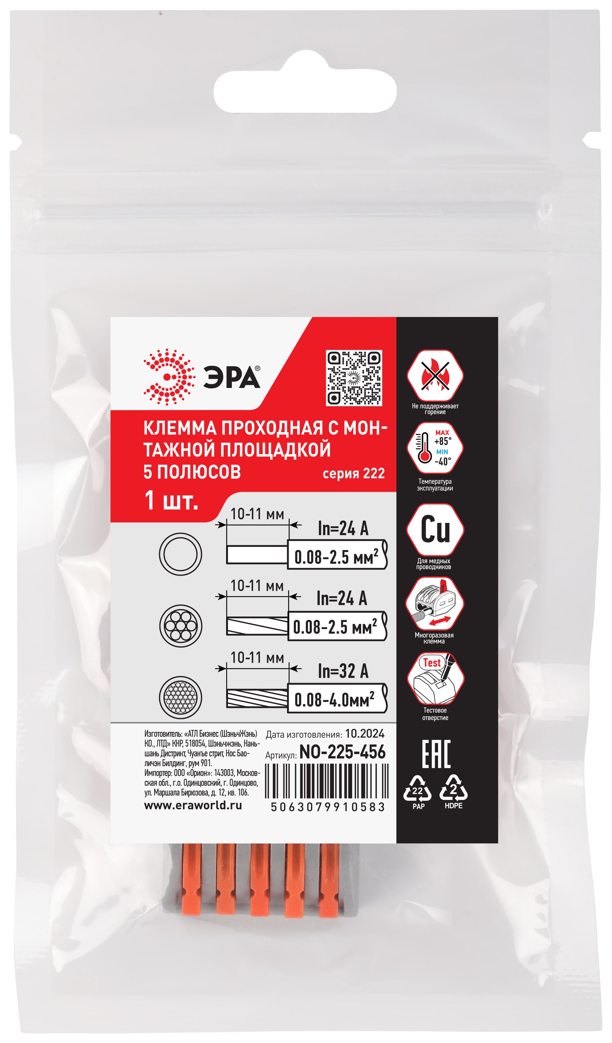 Универсальные проходные клеммы с монтажной площадкой 222 серии с рычагами ЭРА предназначены для создания многократных соединений всех типов проводников (медных одножильных и многожильных, оконцованных втулочными наконечниками НШвИ) без использования специального инструмента. При подсоединении проводников с изолированными наконечниками НШвИ их макс. сечение должно быть на один размер меньше максимального сечения клеммы.