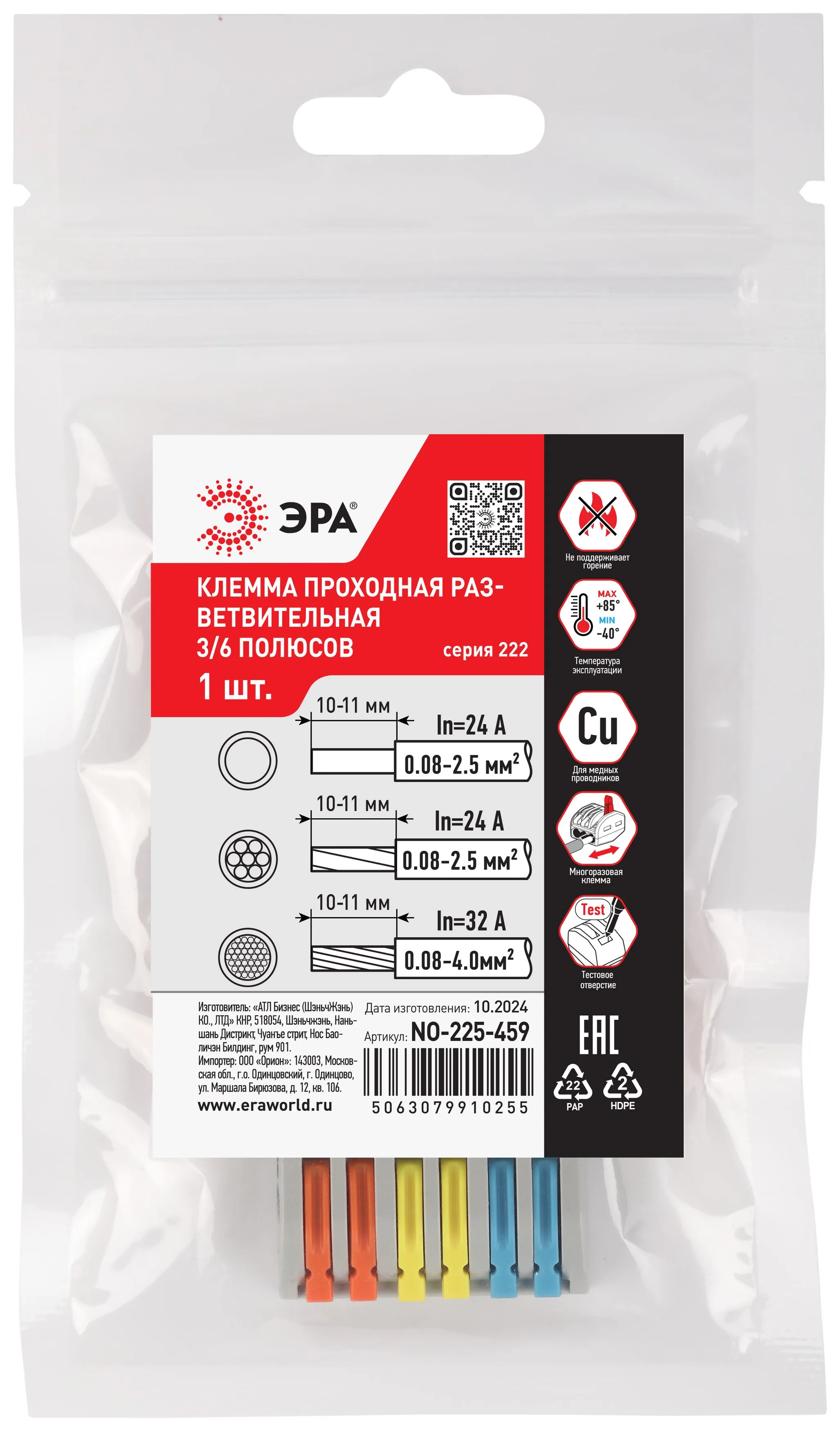 Универсальные проходные разветвительные клеммы 222 серии с рычагами ЭРА предназначены для создания многократных соединений и размножения контактов всех типов проводников (медных одножильных и многожильных, оконцованных втулочными наконечниками НШвИ) без использования специального инструмента. Применяются для размножения электрических цепей при подключении осветительного и другого электрооборудования. Использование универсальных проходных разветвительных клемм позволяет: - создать безопасное разветвлённое проходное соединение, в случае необходимости подключения нескольких потребителей от одного источника питания. - получить возможность легко и быстро отсоединить провода, изменить схему, переключить питание на другую цепь или устройство. - оперативно соединять или наращивать провода, сделанные из разных материалов и разного сечения. Особенности конструкции: - конструкция механизма с рычажками обеспечивает многоразовый монтаж и демонтаж всех типов медных проводников сечением до 4.0 мм2: одножильных, многожильных и тонкопроволочных. - в конструкции корпуса предусмотрены выступы с крепежными отверстиями для установки на плоскую поверхность, монтажную плату или в монтажную коробку. - специально подобранное исходное положение рычага исключает случайное разъединение подключённого проводника. - изделия обладают тестовыми отверстиями, которые дают возможность измерения электрических параметров цепи соединения. - корпус выполнен из полиамида 6.6. Не поддерживает горение, не содержит галогенов по UL94V2. - в состав контактной части входит лужёная латунь с высоким содержанием меди, что гарантирует хорошую электропроводность и низкий нагрев клеммы. - прижимной механизм изготовлен из высококачественной легированной пружинной стали, обеспечивая надежный зажим проводника и стабильность характеристик при многократном использовании.