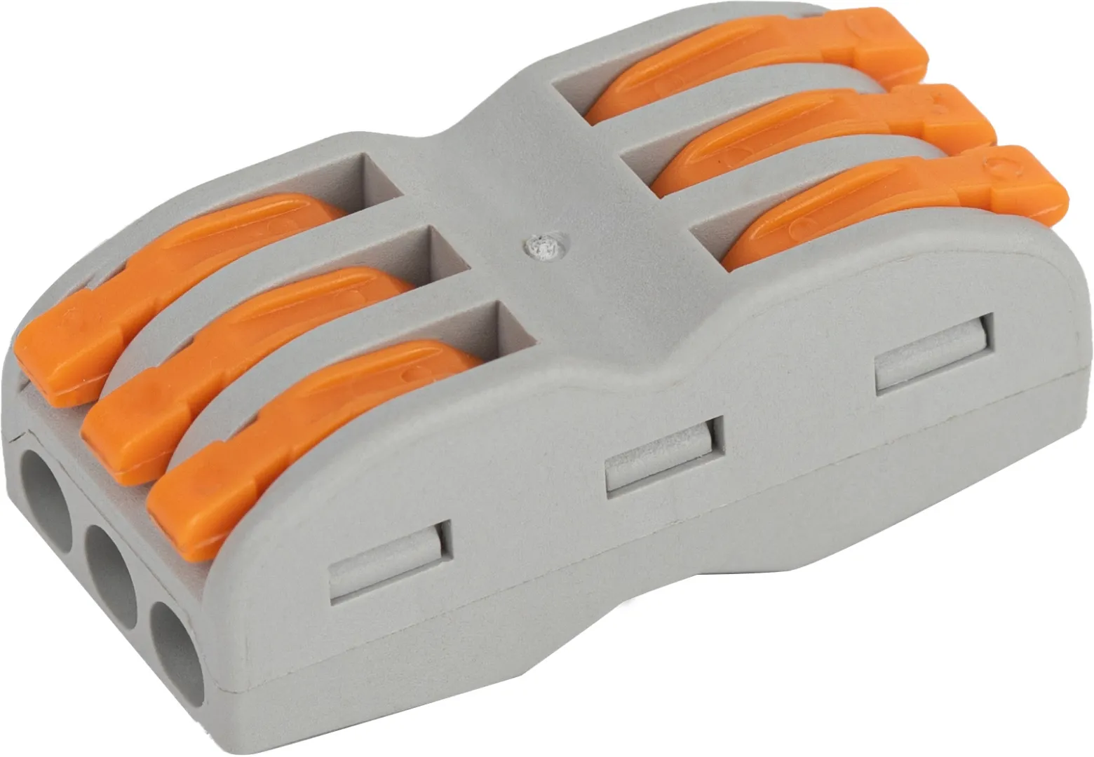 Клеммы СМК с плоско-пружинным зажимом предназначены для многоразового присоединения и ответвления одножильных и многожильных проводников из меди в электрических цепях переменного тока с частотой 50 Гц напряжением до 400 В. Корпус клемм изготовлен из самозатухающего пластика, монтаж не требует использования инструментов. Подходит для многоразового использования. При монтаже необходимо снять изоляцию с проводников в соответствии с обозначениями на корпусе клеммы. Поднимите рычажок, вставьте проводник в гнездо, опустите рычажок в исходное положение.