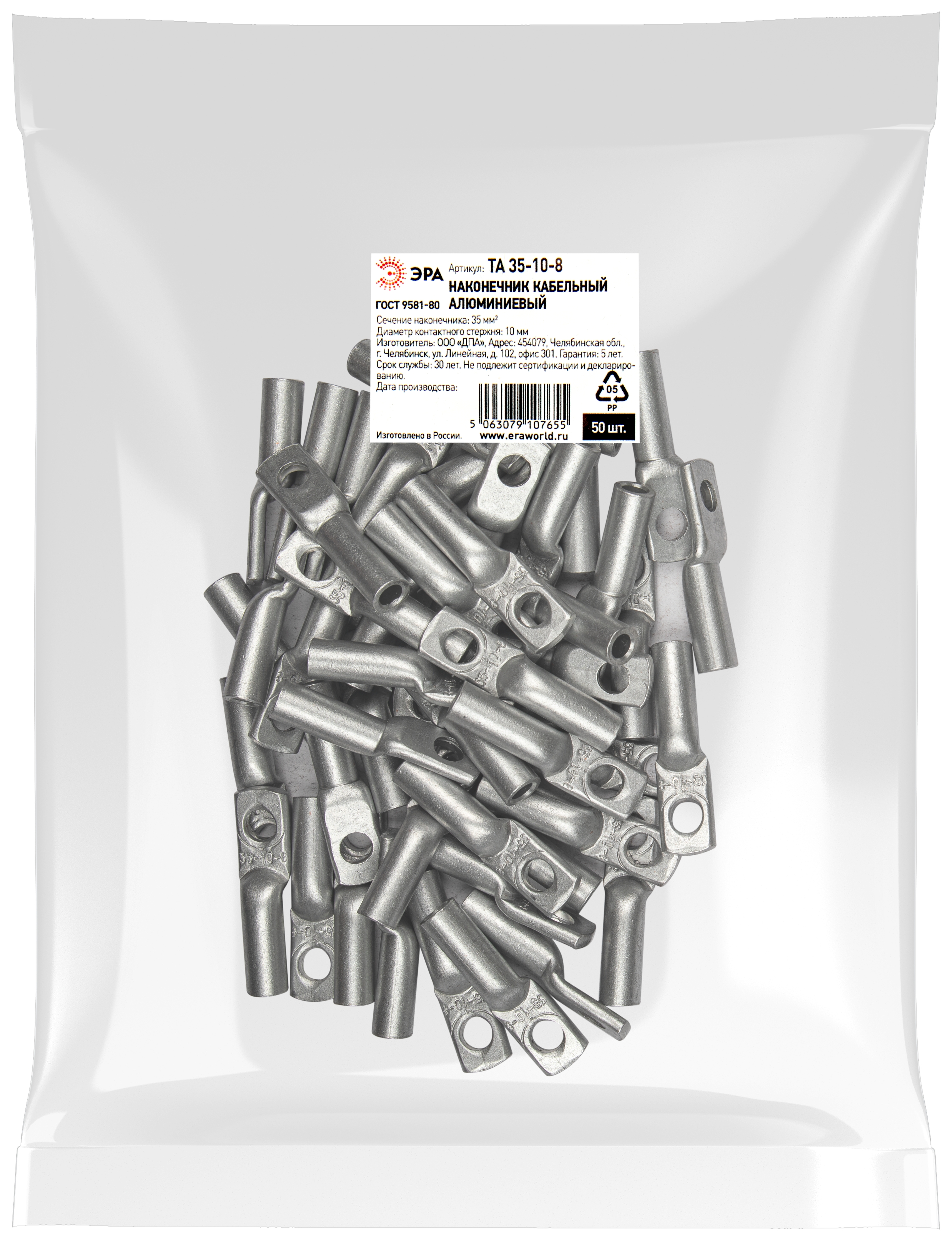 Наконечник кабельный алюминиевый ЭРА ТА 35-10-8 используется для оконцевания проводов и кабелей с алюминиевыми жилами сечением до 35 мм² и применяется для кабелей напряжением до 35 кВ.
