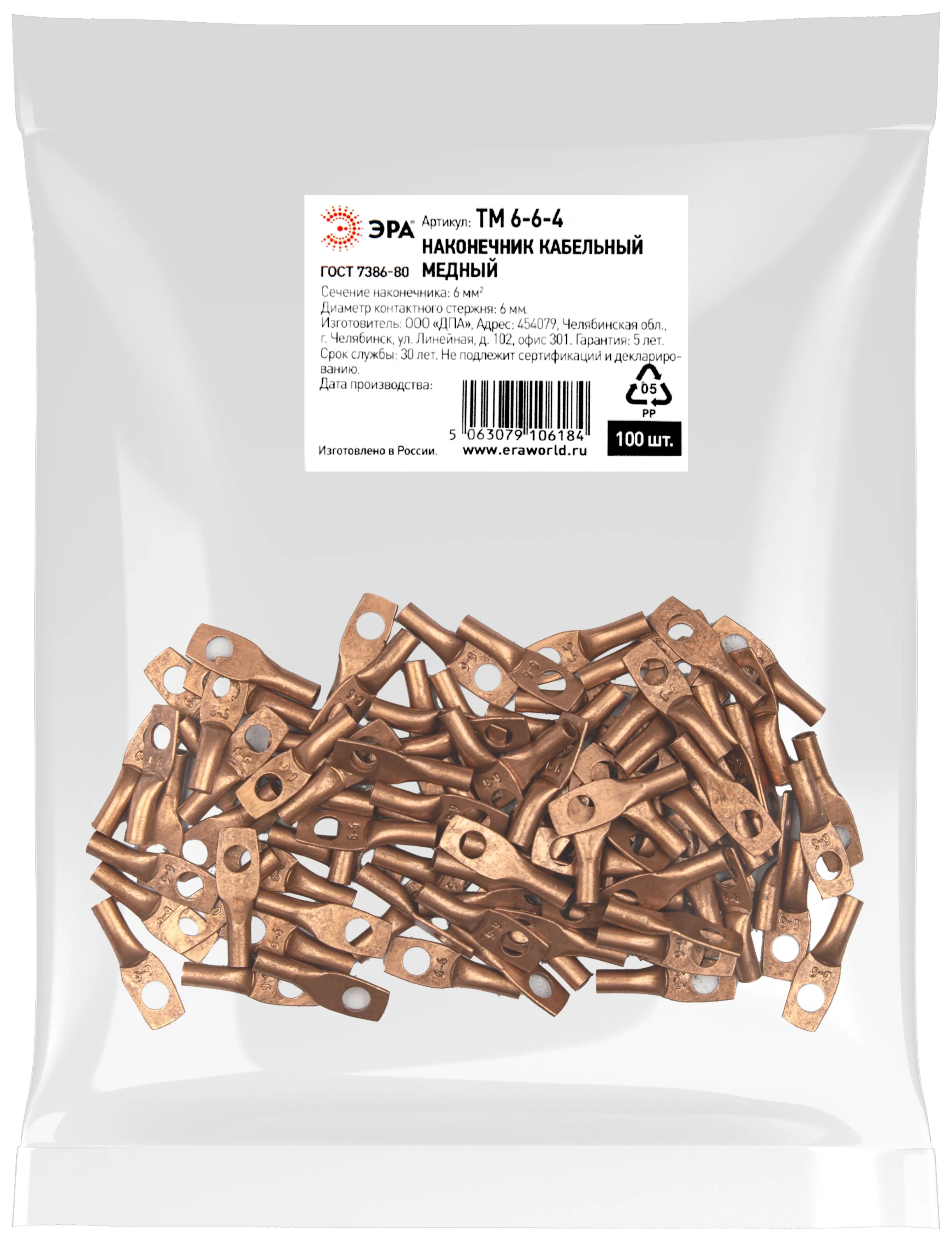Наконечник кабельный медный ЭРА ТМ 6-6-4 используется для оконцевания проводов и кабелей с медными жилами сечением до 6 мм² и применяется для кабелей напряжением до 35 кВ.
