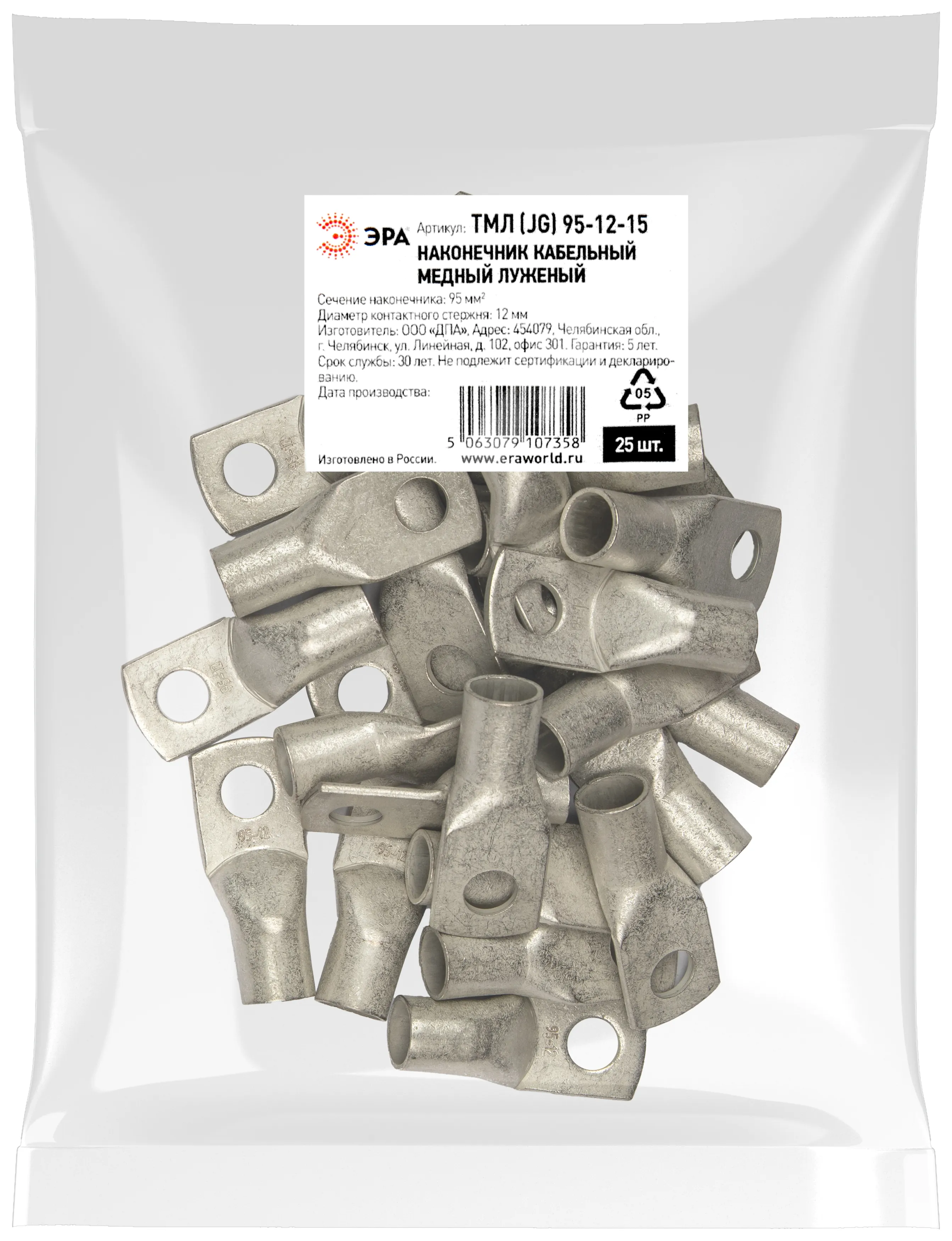 Наконечник кабельный медный луженый ЭРА ТМЛ (JG) 95-12-15 используется для оконцевания проводов и кабелей с медными жилами сечением до 95 мм² и применяется для кабелей напряжением до 10 кВ.
