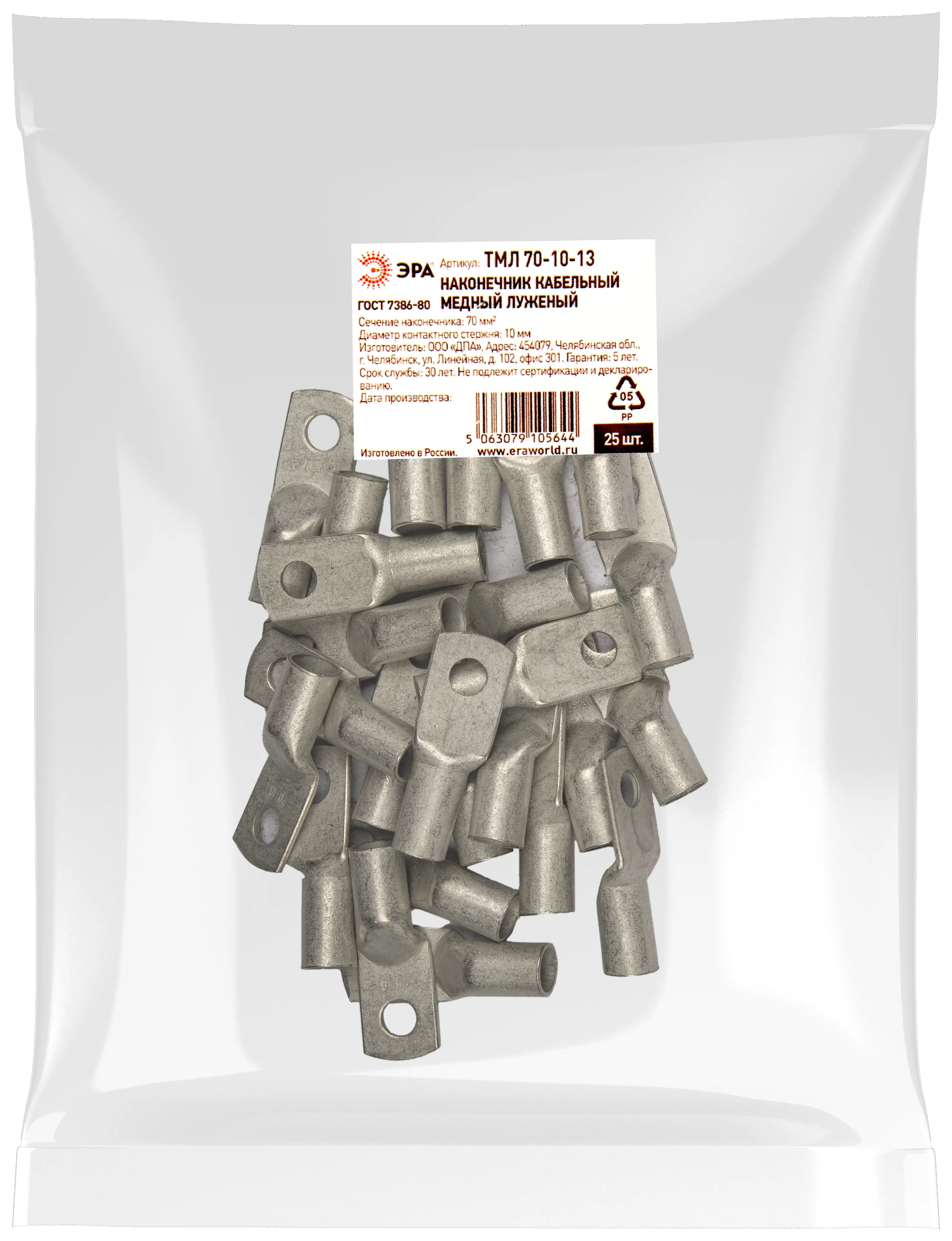 Наконечник кабельный медный луженый ЭРА ТМЛ 70-10-13 используется для оконцевания проводов и кабелей с медными жилами сечением до 95 мм² и применяется для кабелей напряжением до 35 кВ.